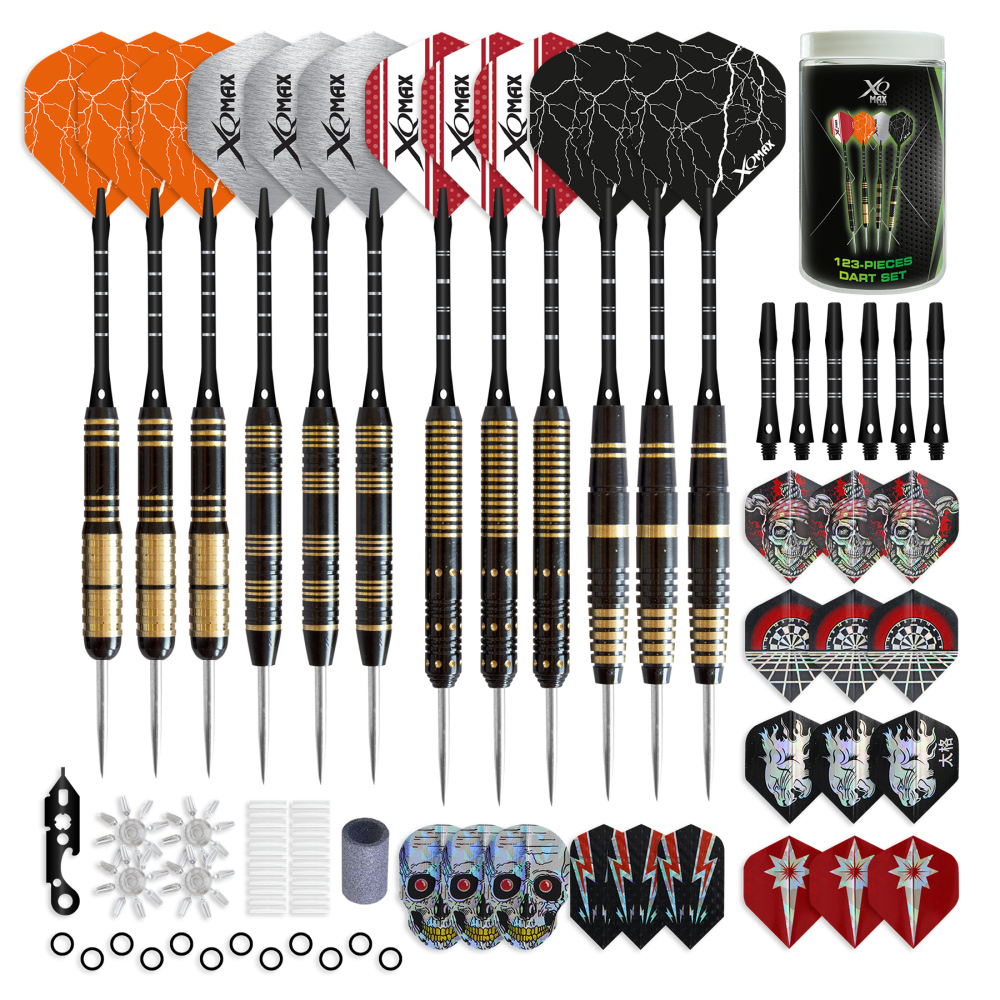 123-dílná sada XQMax šipky 12x Steel Brass + příslušenství – obsahuje 4 sady (po třech šipkách) steel - hlavní/barellů.