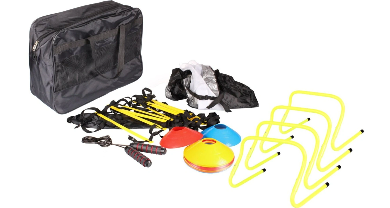 - set: 1x agility žebřík, 20x vytyčovací meta, 1x odporový padák, 1x švihadlo, 4x překážka