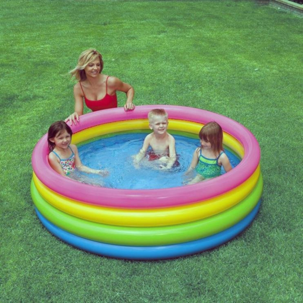 Velká vodní zábava pro děti. Nafukovací bazének ze čtyř kruhů. V pestrých barvách duhy. Měkké dno. Objem cca. 617 litrů. Odolný vůči slunečnímu světlu, oleji a slané vodě. Ideální na zahradu nebo terasu. Včetně opravných záplat.