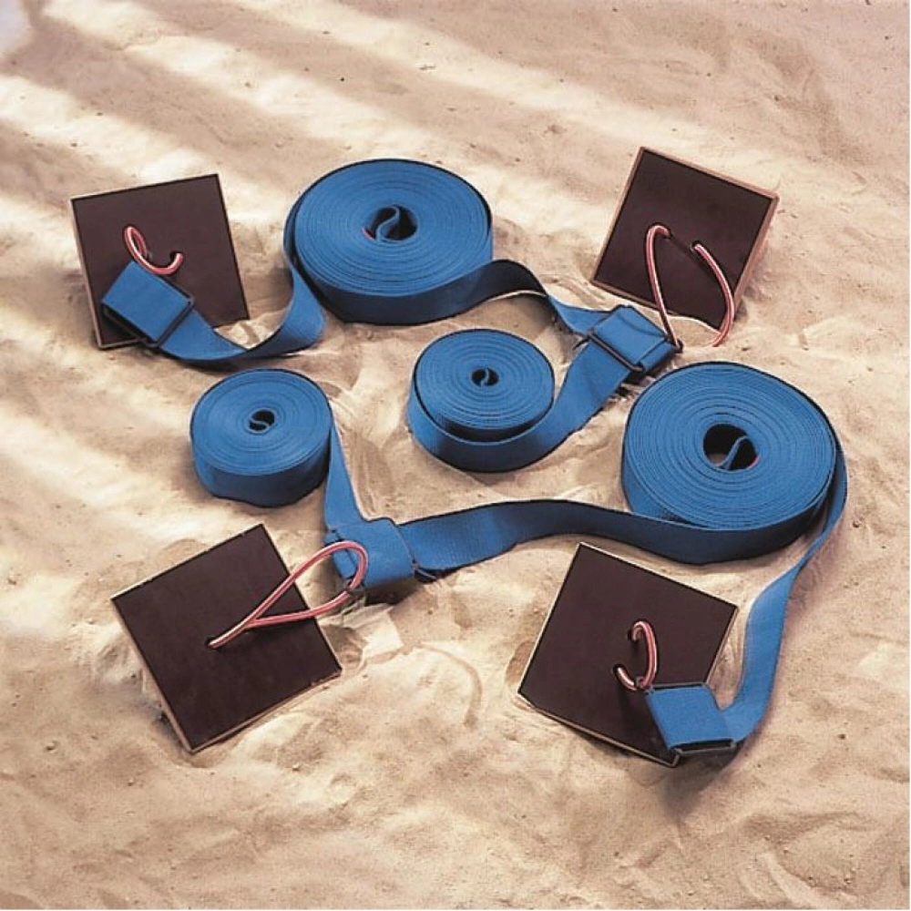 • komplet se 4 kotevními dřevěnými deskami do písku a napínacími gumovými lany