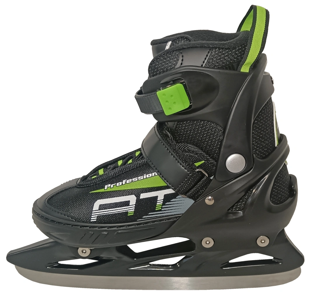 Hokejové brusle, roztahovací - 4 velikosti v jedné botě díky jednoduchému mechanismu na zvětšování a zmenšování skeletu bot. Rozsah nastavení boty na čtyři velikosti 39 - 42 = 24,6 - 26,4 cm. Délka vnitřní stélky, při nejmenší nastavené velikosti, činí 25,5 cm. Brusle jsou tvořeny plastovým skeletem a vnitřní textilní botičkou, která má měkkou výstelku pro zabezpečení nejvyššího komfortu. Pro dosažení řádného upevnění na nohu je k dispozici klasické šněrování, textilní přezka na suchý zip a plastová přezka slouží k dokonalemu upnutí boty na nohu. Brusle mají vodoodpudivou povrchovou úpravu (impregnaci), která zabraňuje pronikání vlhkosti do boty a zároveň tak brání prochladnutí nohy. Přesto doporučujeme občas brusle naimpregnovat běžně dostupnými impregnačními prostředky. Brusle mají hokejový nůž.