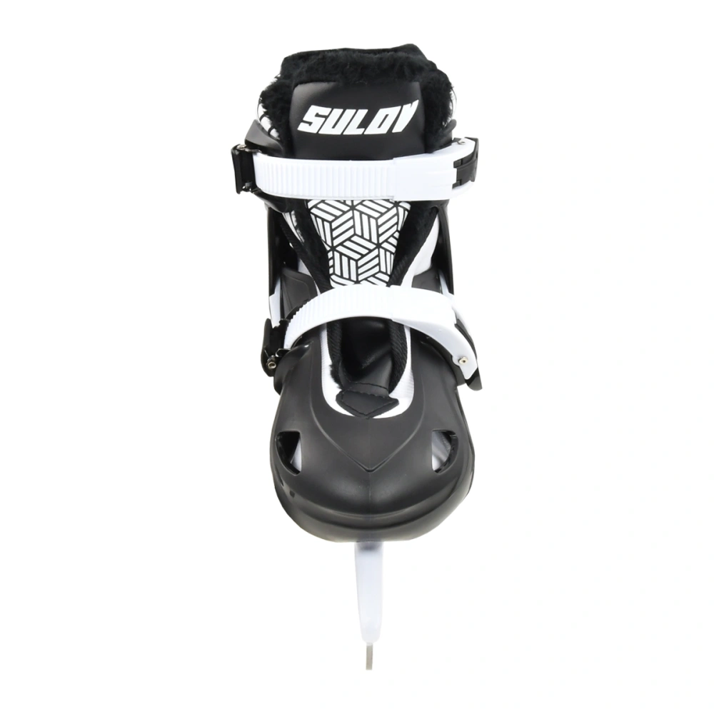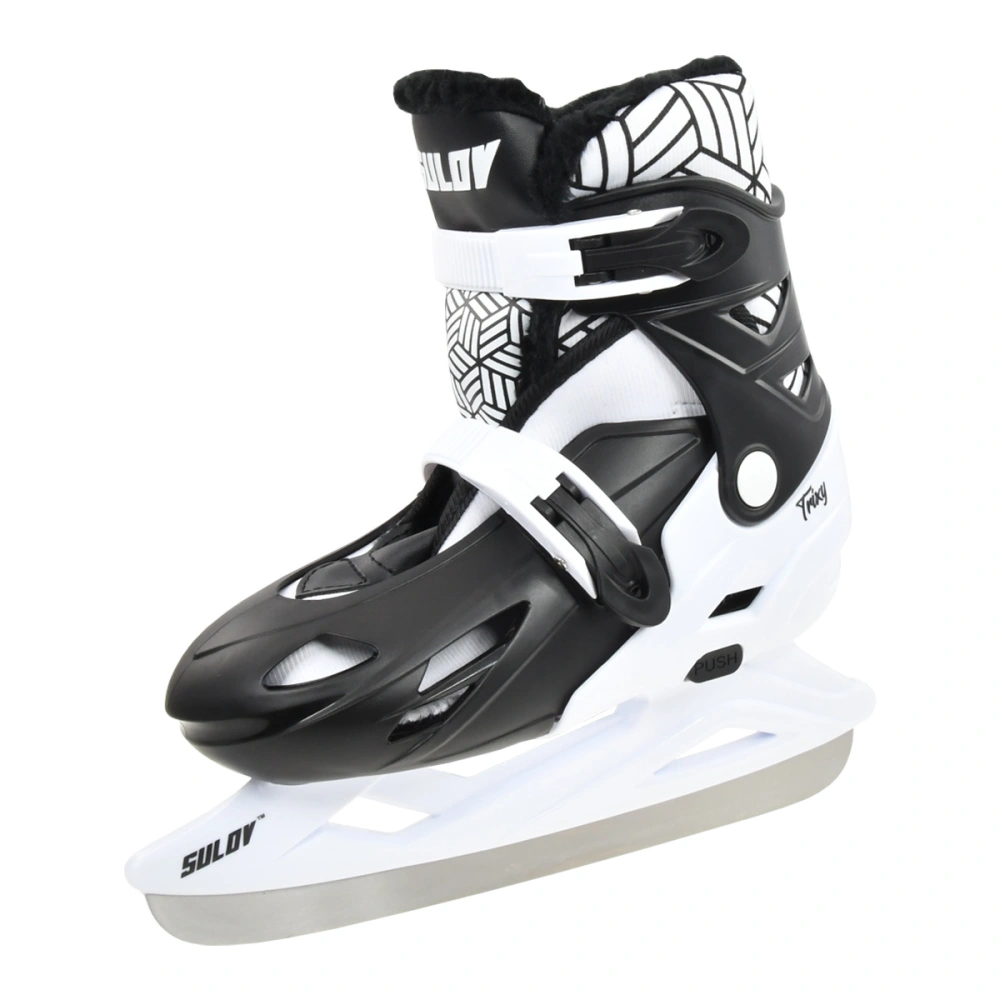 Chlapecké nastavitelné zimní brusle. Rychleschnoucí prodyšná výstelka pro pohodlné nošení. Brusli lze jednoduše nastavit dle potřeby na 4 velikosti pouhým stisknutím tlačítka na boku v patě brusle.