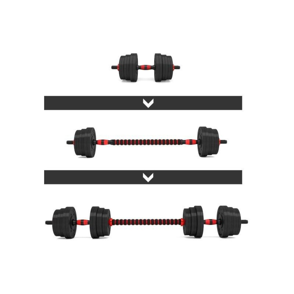 Kompletní nakládací sada dvou jednoručních a jedné obouruční činky. K dispozici totiž máte hned několik možností, jak sadu využít. Buď si můžete sestavit klasické jednoruční činky pomocí dvou krátkých os nebo pomocí spojovací tyče vytvoříte delší obouruční činku, kterou si už nastavíte a zatížíte dle potřeby. Spojovací tyč dokáže propojit i obě kratší osy. Kotouče jsou vyrobeny z tvrzeného plastu, který je vyplněn cementem. Povrchový plast slouží jako ochrana samotných kotoučů i povrchu, na který činku položíte. Osy jsou opatřeny bezpečnostními maticemi.