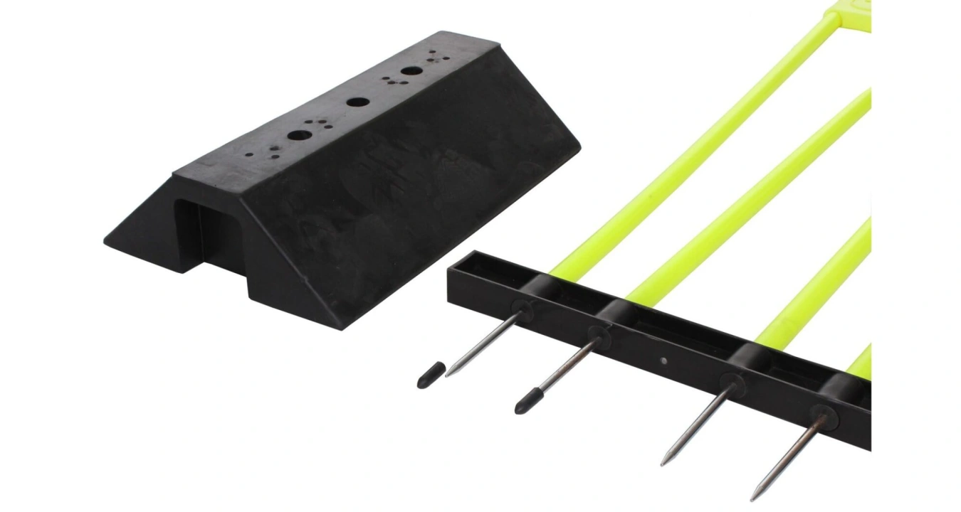 Stojan na tvrdé povrchy Defence Mannequin Base je doplňkem k fotbalové tréninkové figuríně, který umožní tuto pomůcku využívat na umělém, nebo jiném tvrdém povrchu. Pevný a stabilní stojan je vyrobený z kvalitní lisované gumy ve tvaru písmene "A" s rozměrem (výška x šířka x délka): 11 x 32 x 48 cm a hmotností 10,5 kg. Bodce tréninkové figuríny stačí zasunout do předvrtaných otvorů a fotbalový trénink s nácvikem trestných kopů a dalších herních situací může začít.
