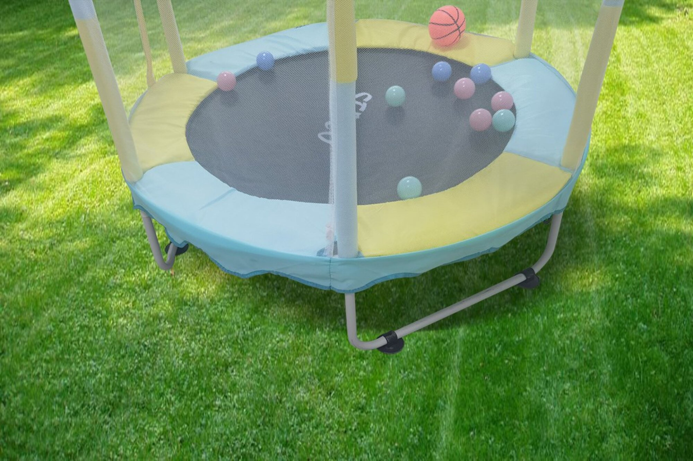 Moderní dětská trampolína o průměru 122 cm s ochrannou sítí a sadou hraček. Spolehlivý potah z odolného PE materiálu a výplní krytu 6mm. Pevná konstrukce i velmi dobrá odrazová schopnost jsou samozřejmostí. Stabilitu zajišťují odolné kovové nožky. PE Ochraná síť skvěle doplňuje bezpečnost. Vhodné pro vnější i vnitřní použití. V sadě také spousta hraček pro ještě příjemnější čas na trampolíně. Foto je ilustrační.