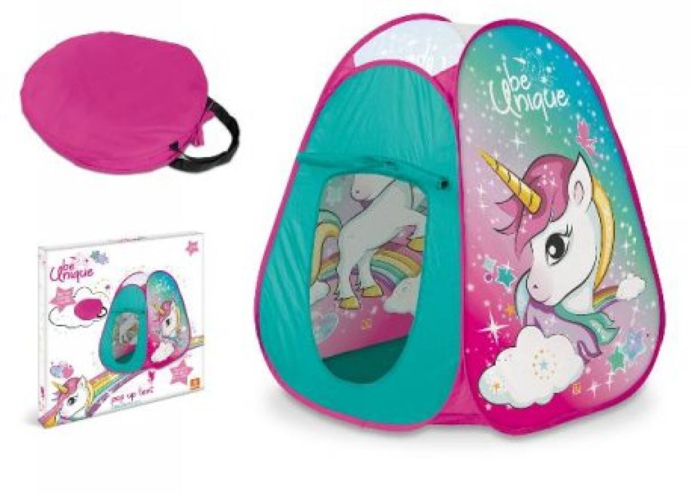 Dětský stan Pop Up od italského výrobce Mondo je nádherný stan pro všechny děti a zejména dívky od 3 let. Dětský stan je vyhotoven v pěkné růžovo-modré kombinaci s motivem jednorožce. Stan pro děti je vyroben z kvalitních materiálů, velmi snadno se rozkládá a skládá. Součástí dětského stanu je i kulatá přenosná taška s držadlem, do které se stan pohodlně sbalí. Rozměry tohoto dětského stanu jsou 85x85x95 cm, přičemž jeho celková výška je 95 cm. Stan se dá umístit na zahradu, na dvůr, rovněž jej děti využijí na výletech a dovolené, ale i ve svém dětském pokojíčku. Tato hračka pro děti rozvíjí u dětí představivost, fantazii a kreativitu.