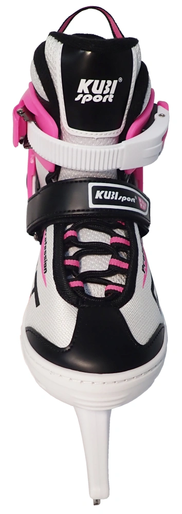Dívčí brusle, roztahovací - 4 velikosti v jedné botě díky jednoduchému mechanismu na zvětšování a zmenšování skeletu bot. Rozsah nastavení boty na čtyři velikosti 28 - 31 = 18,5 - 19,8 cm. Délka vnitřní stélky, při nejmenší nastavené velikosti, činí 18,5 cm. Brusle jsou tvořeny plastovým skeletem a vnitřní textilní botičkou, která má měkkou výstelku pro zabezpečení nejvyššího komfortu. Pro dosažení řádného upevnění na nohu je k dispozici klasické šněrování, textilní přezka na suchý zip a plastová přezka slouží k dokonalemu upnutí boty na nohu. Brusle mají vodoodpudivou povrchovou úpravu (impregnaci), která zabraňuje pronikání vlhkosti do boty a zároveň tak brání prochladnutí nohy. Přesto doporučujeme občas brusle naimpregnovat běžně dostupnými impregnačními prostředky.