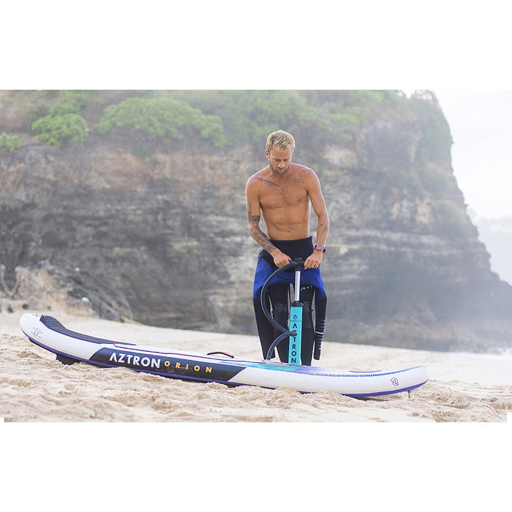 Dvojčinná vysokotlaká pumpa AZTRON určená pro nafukování paddleboardu. Pumpa obsahuje manometr pro snadné sledování dosaženého tlaku. Dosažitelný tlak až 27 PSI, přepínač "double/single action" (při dofukování na požadovaný tlak přepnete na "single action" pro snažší obsluhu). Funkce "double action" znamená, že pumpa tlakuje jak při tahu směrem vzhůru, tak i při stlačení dolu. Tato funkce je vhodná pro nafouknutí velkého objemu vzduchu. Pumpa je navržena pro maximální tlak do 27.5 PSI (1.8 baru).