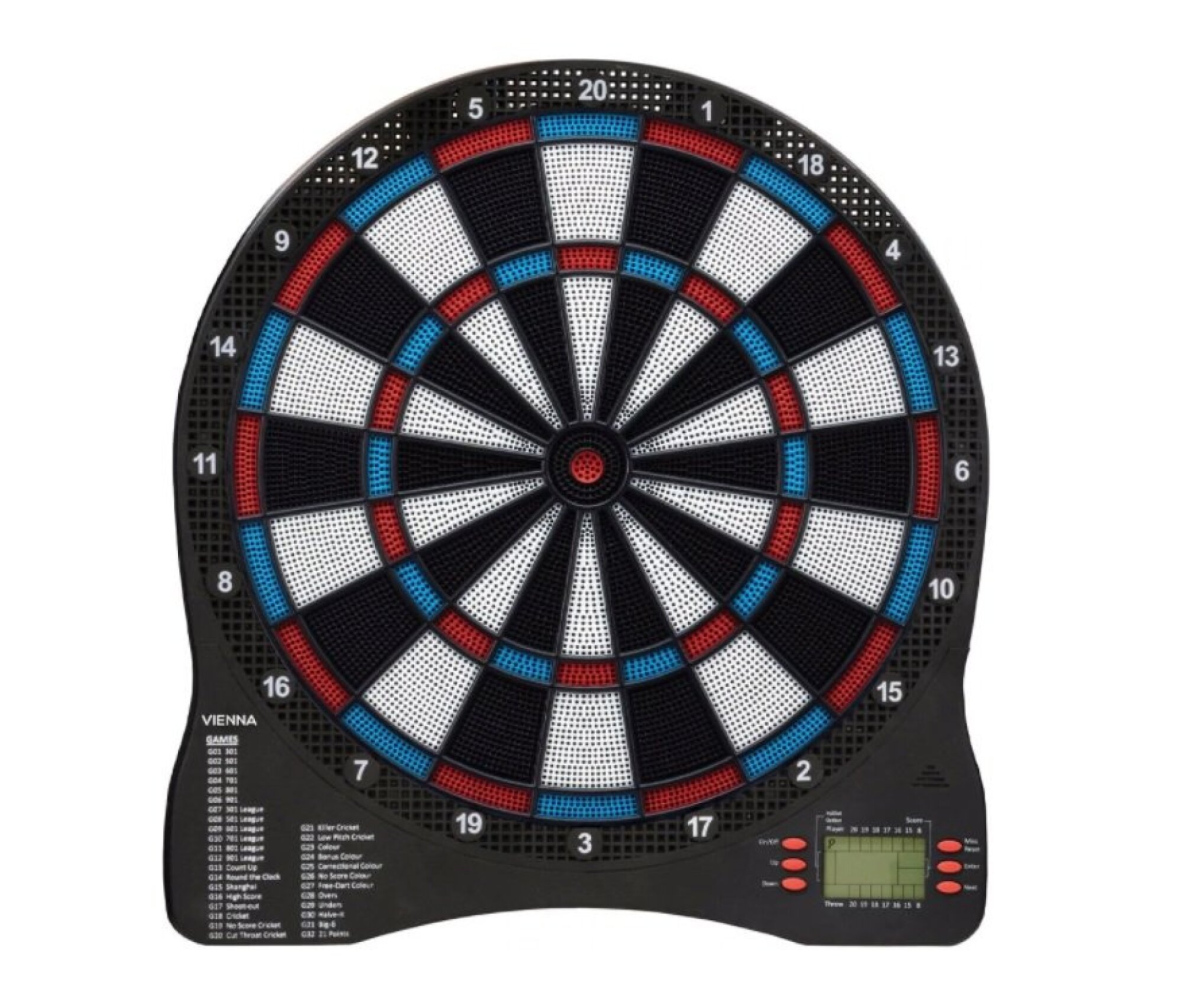 Šikovný elektronický terč v atraktivním designu. Díky 31 vestavěným hrám a více než 285 variantám si mohou vybrat začátečníci i pokročilejší hráči. Součastně může hrát 1-8 hráčů, výchozí počet hráčů je 2. Terč je navržen na napájení 3 x 1,5 V AA (LR6) baterií (není součástí). Pro úsporu baterií je tento terč vybaven režimem automatického vypnutí. Pokud terč nepoužíváte, přejde za 30 minut do režimu spánku.