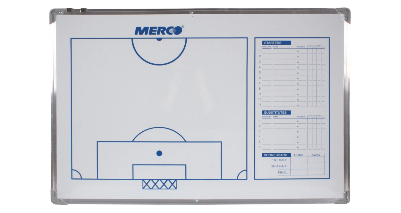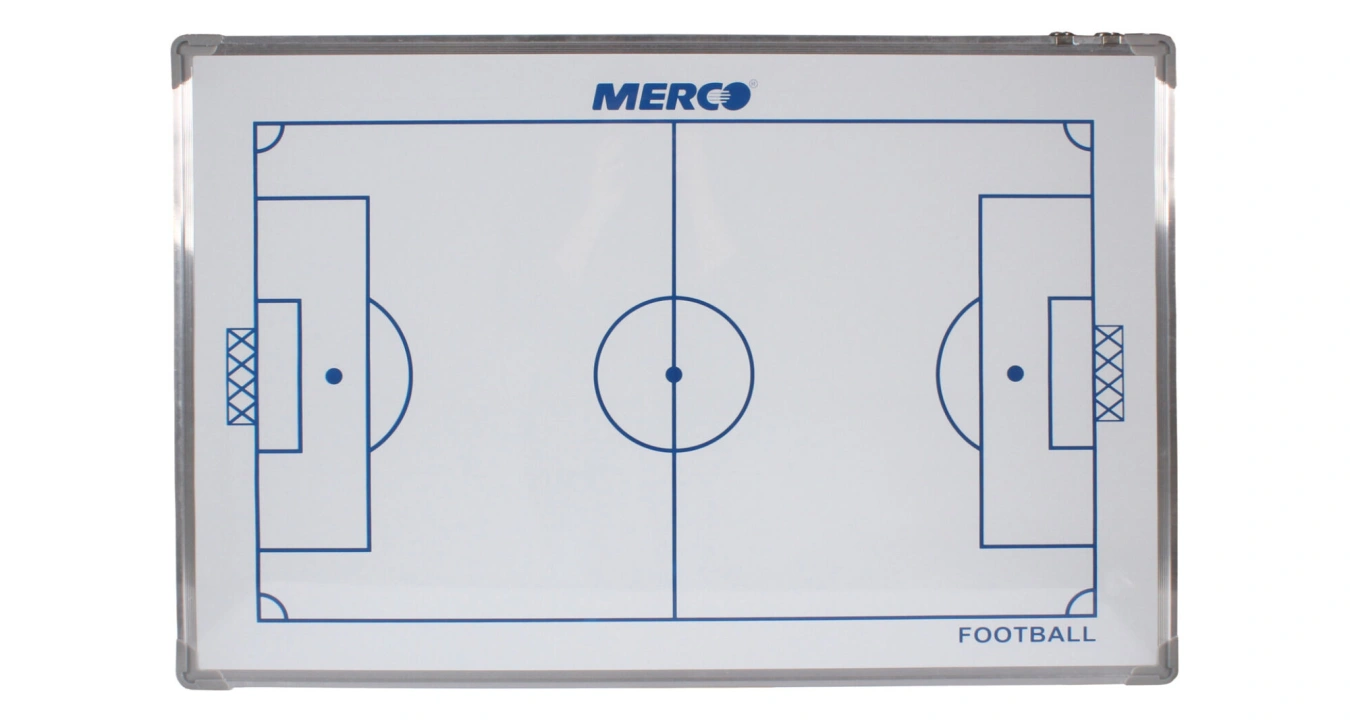 Fotbalová trenérská tabule je užitečným asistentem trenérů napříč všemi soutěžemi. Taktická tabule Football 90 je magnetická deska se dvěma sadami magnetů pro plánování a analýzu výkonů hráčů. Oboustranně magnetická tabule zobrazuje fotbalové hřiště na jedné straně. Na druhé straně je ze dvou třetin znázorněná polovina hřiště a tabulka pro soupisku hráčů. Součástí tabule Football 90 jsou dvě sady číslovaných magnetů 1 – 11 a čtyři další magnety reprezentující rozhodčí a míč, součástí je také černý popisovač a houbička pro detailnější popis herní strategie. Tabule je usazená v aluminiovém rámu s rozměry 90 x 60 x 2 cm a má hmotnost přibližně 2 kg. Na horním okraji tabule jsou dva háčky pro případné zavěšení na zeď. Předejte potřebné instrukce vašim hráčům pomocí trenérské tabule srozumitelným a jasným způsobem díky taktické tabuli Football 90.
