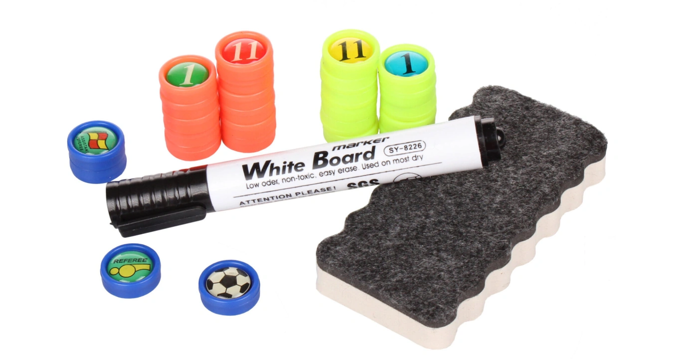 Taktická tabule pro fotbalové trenéry. Rozměr 90 x 60 cm, včetně sady magnetů, popisovače a houbičky.