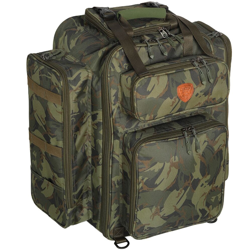 Celá přední část batohu výklopná a uzavíratelná na zip. Batoh má pět vnějších kapes po stranách. Plně polstrovaná zadní část pro pohodlné nošení, včetně komfortních ramenních popruhů. Měkčené EVA poutka pro snadnou a pohodlnou manipulaci. Boční poutka k uchycení podběráku, vidliček a vrchní k upevnění podložky. Vodě odolný materiál v kamuflážovém vzoru a spodní dno z omyvatelného materiálu.
