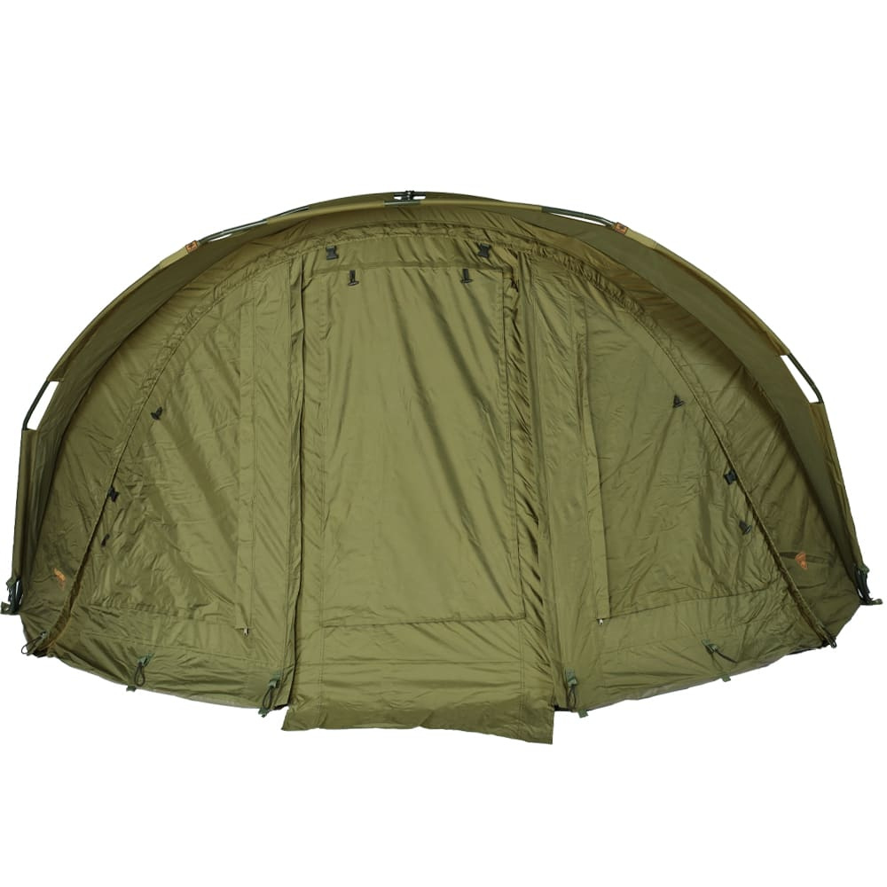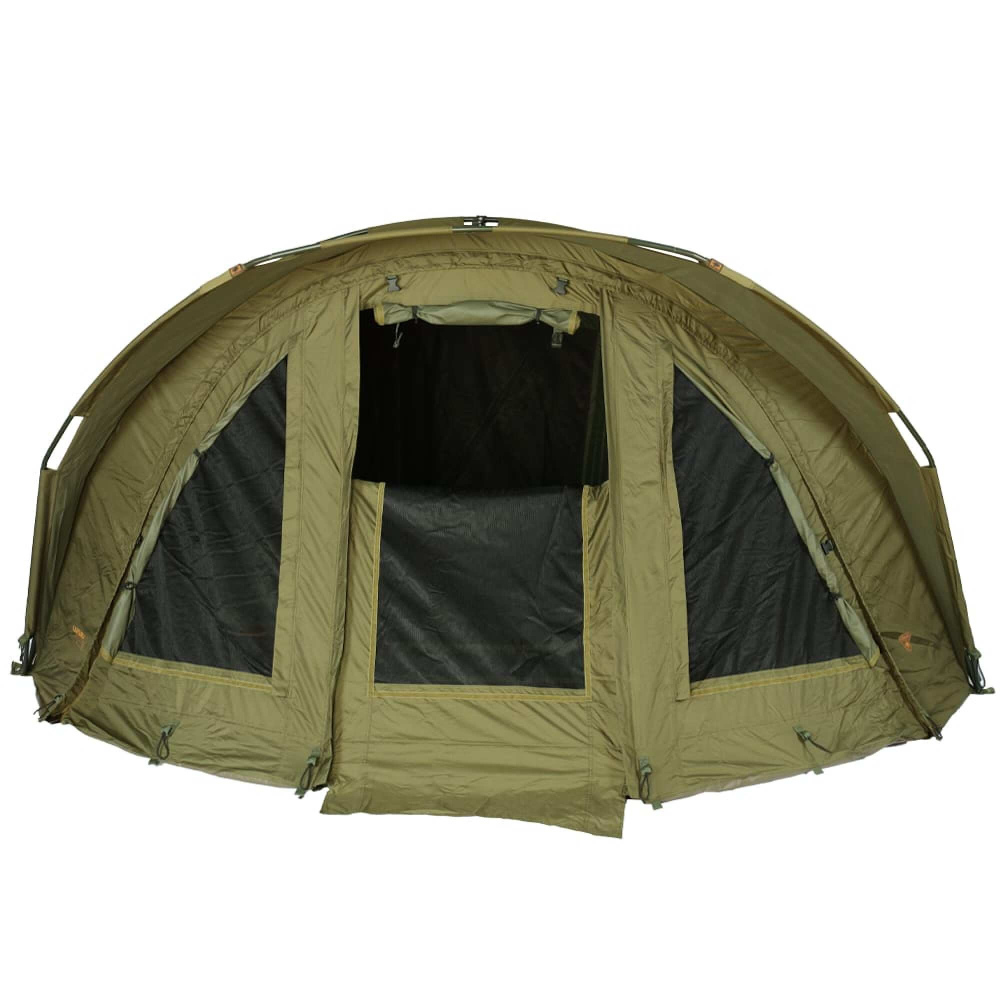 Přístřešek trubkové konstrukce, která se skládá ze tří žeber a o výztuhu se starají rozpěrné tyče. Na tento bivak, byl použit vysoce kvalitní vodě odolný materiál 10 000mm HH, který je 100% nepromokavý. Páskou podlepené švy a ukotvení na zavrtávací kolíky, které jsou v ceně přístřešku. Bivak je vybaven vylepšeným větracím systémem, které zajišťují dvě přední okna, tak tři velká v zadní části, které zajistí maximální odvětrání. Velký přední kšilt nad vchodem, je navíc osazen dvěma praktickými úchyty na pruty. Přední vchodová část má tři výměnné panely na suchý zip, celo zakrytá, slída nebo moskytiéra. Další vychytávkou tohoto bivaku je, že v nepřízni počasí můžete ve vchodové části vytvořit okénko, díky použití dvojitých jezdců zipu. Další praktická věc, celí přední panel lze odepnout pomocí zipu a máte otevřený přístřešek. Přístřešek je dodáván s kvalitní pogumovanou podlážkou, která se k bivaku připne pomocí klasického zipu, díky tomu Vám do bivaku nevleze hmyz a nezateče voda. Pro lepší a snadnou orientaci osazení podlážky do bivaku, jsme nechali našít 3D označení vstupu. Součástí bivaku je přepravní nylonová taška.