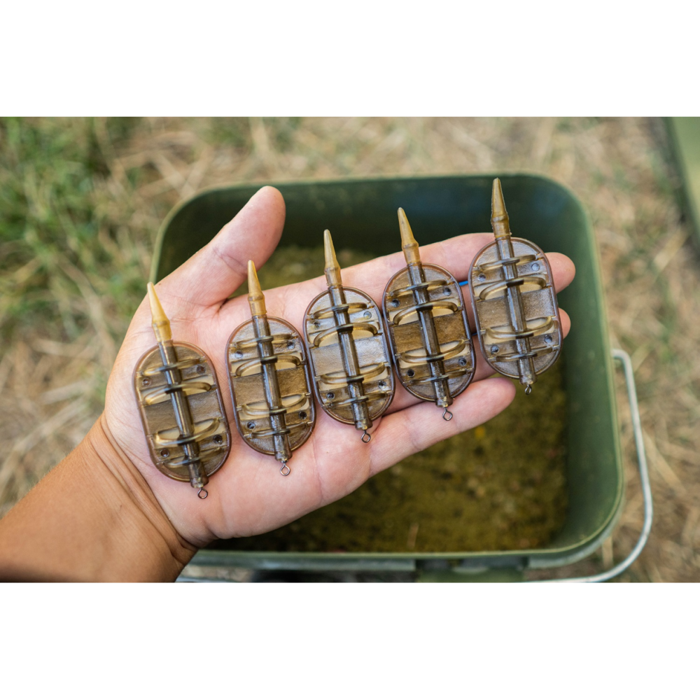 Se stlačenou krmítkovou směsí nebo peletami odhodíte daleko i za silného větru. Tvar krmítka zaručuje, že drží při dně i v proudu. Součástí krmítka je obratlík velikosti č. 8, který můžete popřípadě vyměnit za rychlovýměnný, pro rychlou výměnu návazce. Při vyjmutí obratlíku můžete krmítko používat jako průběžné.