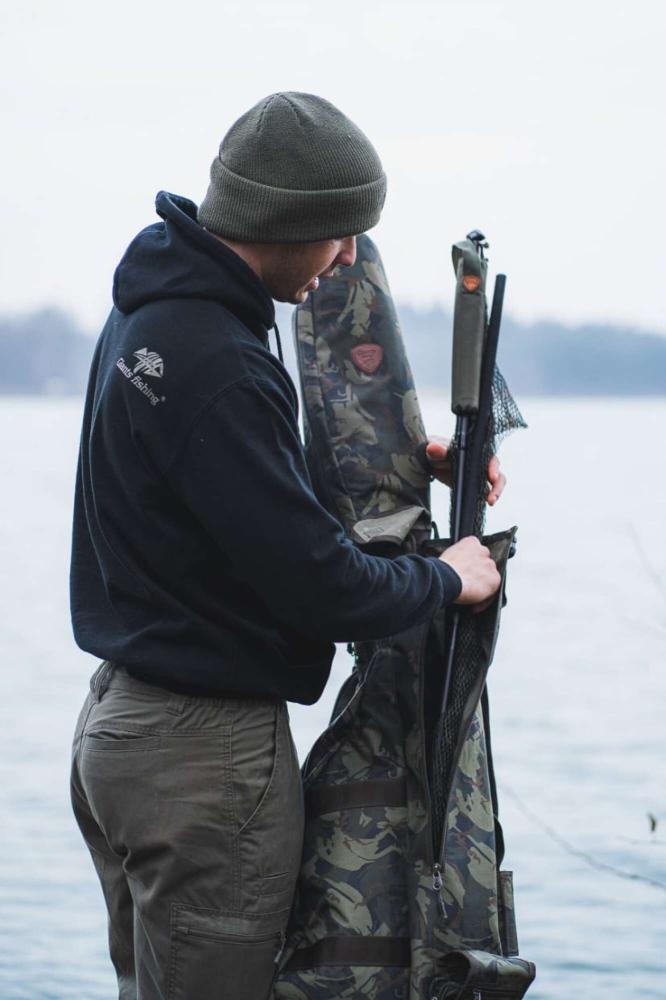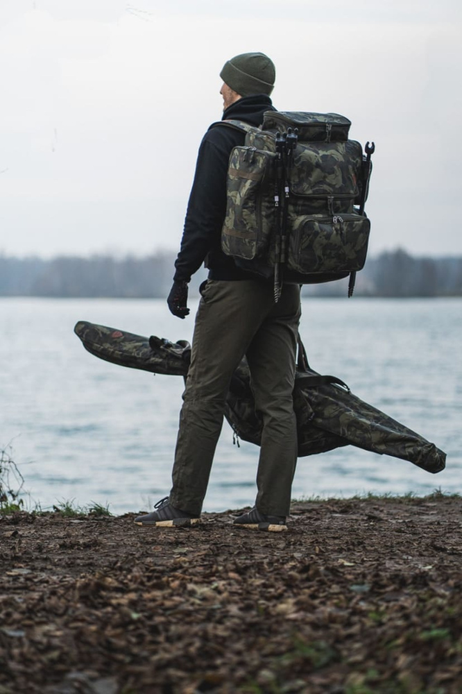 Maximální ochrana pro dva dvoudílné pruty včetně navijáků (bez problému se vejdou i velkokapacitní navijáky). Kvalitní a široké zipy po celé délce, které zajistí dlouhou životnost tohoto pouzdra. Provedení v atraktivním kamuflážovém vzoru a použitý materiál nylon 210D s vodě odolným provedením. Samozřejmostí je polstrované provedení, které zajistí maximální ochranu Vašich prutů s navijáky. Hlavní popruh přes rameno je délkově nastavitelný a částečně polstrovaný. Z jedné strany jsou dvě kapsy, ta delší je určená na podběrák a ta kratší na vidličky. Z druhé strany naleznete částečnou kapsu se stahovacím popruhem pro uchycení deštníku. Tento obal je určen pro dva dvoudílné kaprové pruty v délce 3,6m (12ft).