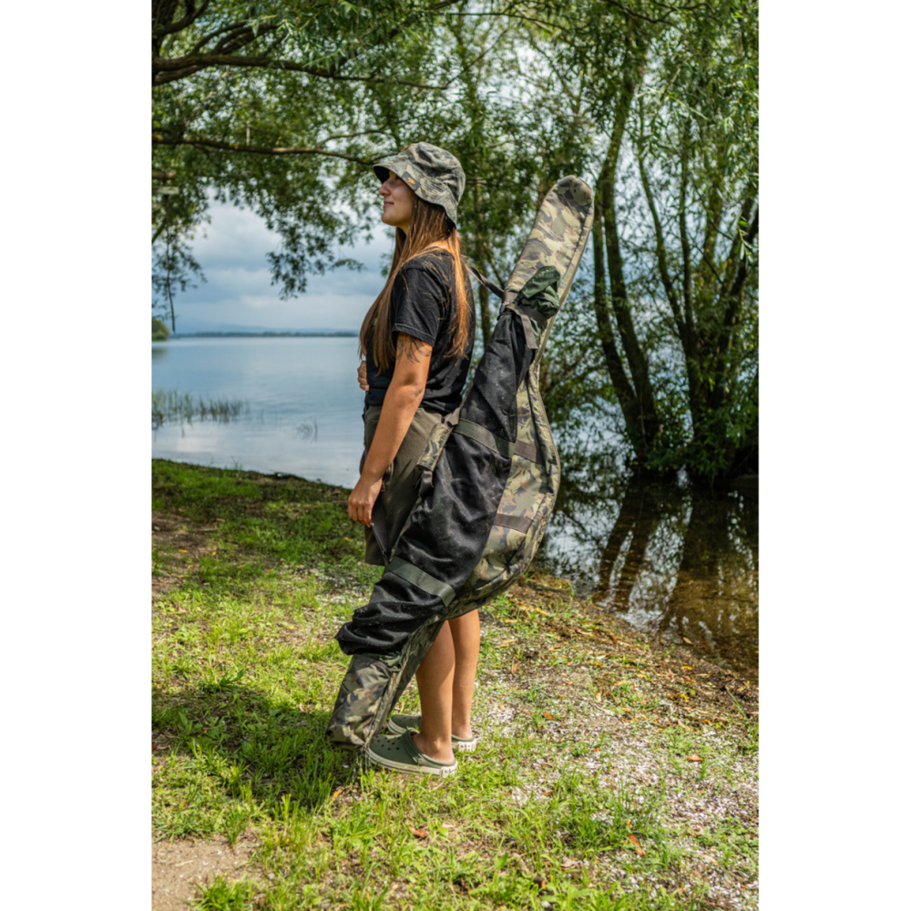 Maximální ochrana pro dva dvoudílné pruty včetně navijáků (bez problému se vejdou i velkokapacitní navijáky). Kvalitní a široké zipy po celé délce, které zajistí dlouhou životnost tohoto pouzdra. Provedení v atraktivním kamuflážovém vzoru a použitý materiál nylon 210D s vodě odolným provedením. Samozřejmostí je polstrované provedení, které zajistí maximální ochranu Vašich prutů s navijáky. Hlavní popruh přes rameno je délkově nastavitelný a částečně polstrovaný. Z jedné strany jsou dvě kapsy, ta delší je určená na podběrák a ta kratší na vidličky. Z druhé strany naleznete částečnou kapsu se stahovacím popruhem pro uchycení deštníku. Tento obal je určen pro dva dvoudílné kaprové pruty v délce 2,7m (9ft).