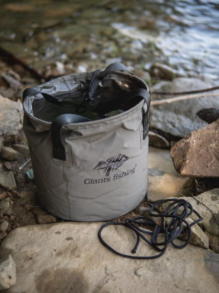 Součástí tohoto vědra je šňůra s karabinou, díky tomu můžete snadno nabrat vodu z lodi, nebo vyššího břehu.