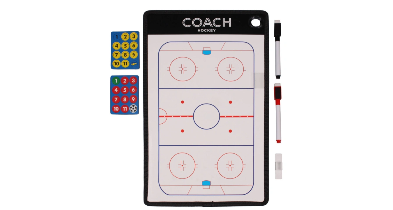 Hockey 38 patří mezi základní vybavení každého trenéra hokeje a slouží pro demonstrování a plánování herních strategií. Pro rozmístění hráčů v poli využijete dvě sady odlišně barevných magnetů s čísly a pro další tahy a znázornění pohybů hráčů popisovač s houbičkou. Magnetická tabule nabízí z jedné strany náhled na celé hřiště a z druhé strany na polovinu hřiště. Taktická deska Merco Hockey 38 je nejsnazší a nejrychlejší cesta pro vaše přesné herní pokyny hráčům kdykoliv během zápasu!
