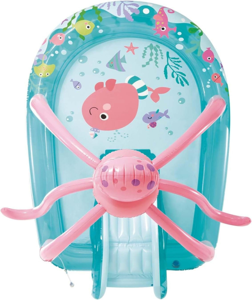 Zábavné nafukovací hrací centrum v motivu veselé chobotnice. Stabilní konstrukce hracího centra s bazénkem, skluzavkou a sprškou, která po napojení na zahradní hadici stříká vodu. V balení jsou také 2 házecí kroužky, které lze házet na chapadla chobotnice. Spolehlivý materiál s měkkými nafukovacími stěnami zajišťuje bezpečnost pro děti. Kapacita bazénu je 229L s výškou hladiny 14 cm. Nafukovací hračky a potřeby Intex splňují nejpřísnější bezpečnostní normy na zpracování a použité materiály.