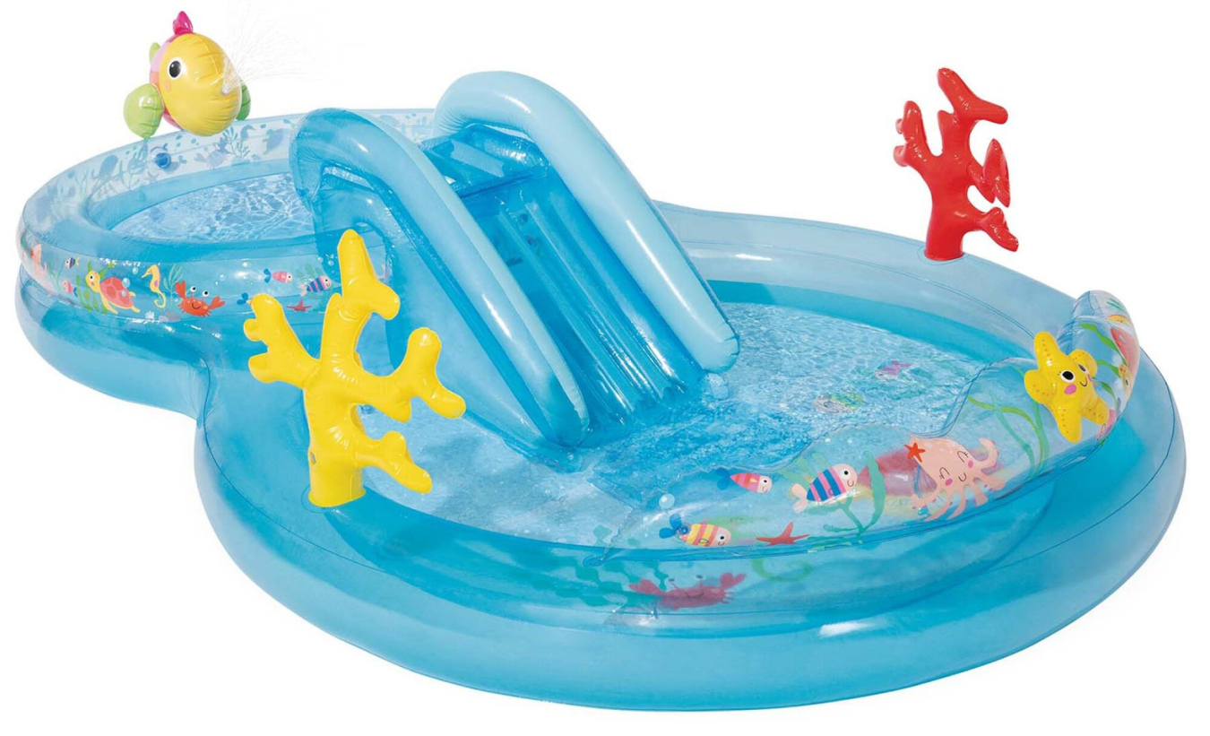 Parádní dětský nafukovací vodní koutek s motivem podmořského světa, který určitě nadchne všechny malé milovníky vody. Toto roztomilé nafukovací hrací centrum s mořskými tvory nabízí bazének s nafukovací podlážkou, kropenou skluzavku, a spoustou mořských rostlin a zvířátek. Toto dětské centrum jednoznačně potěší Vaše nejdražší a o jedinečnou zábavu na léto mají postaráno!