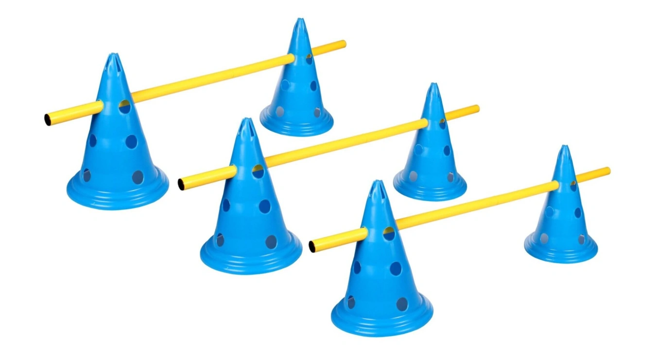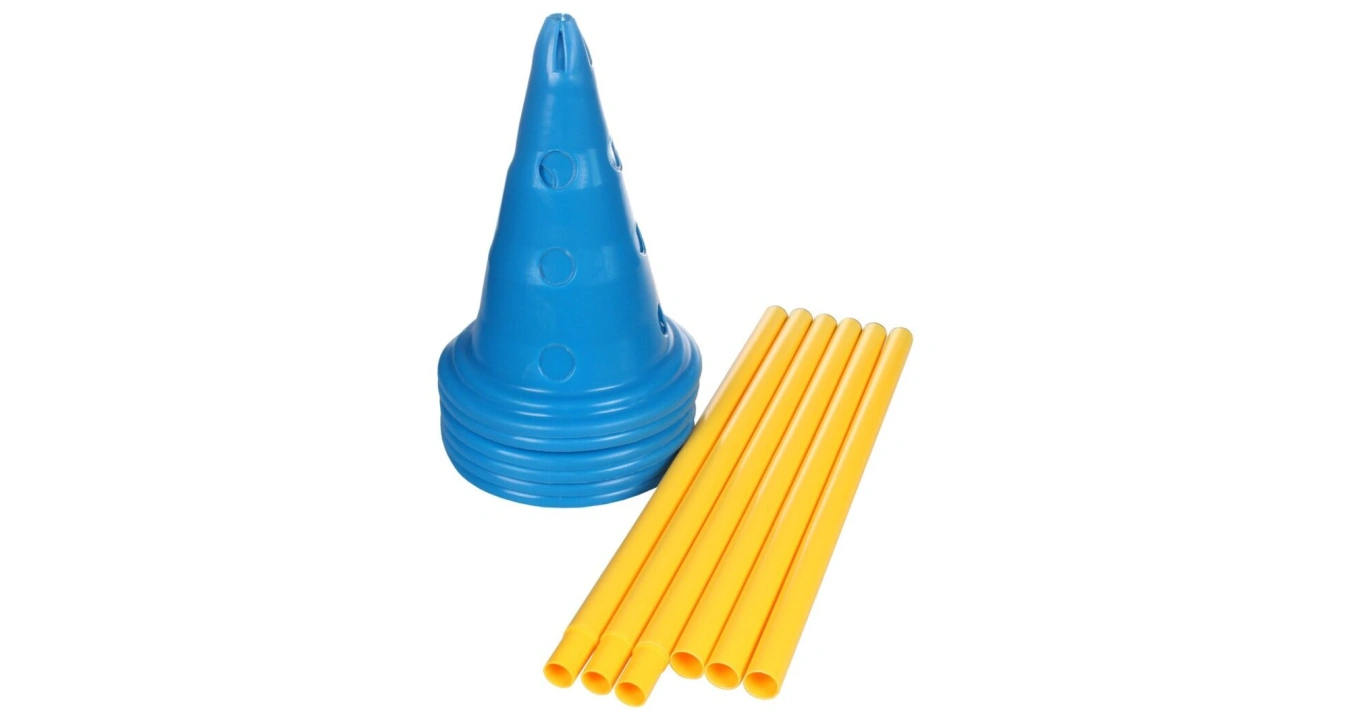 Sada šesti kuželů s otvory, výškou 30 cm a třemi skládacími tyčemi s délkou 1 m.