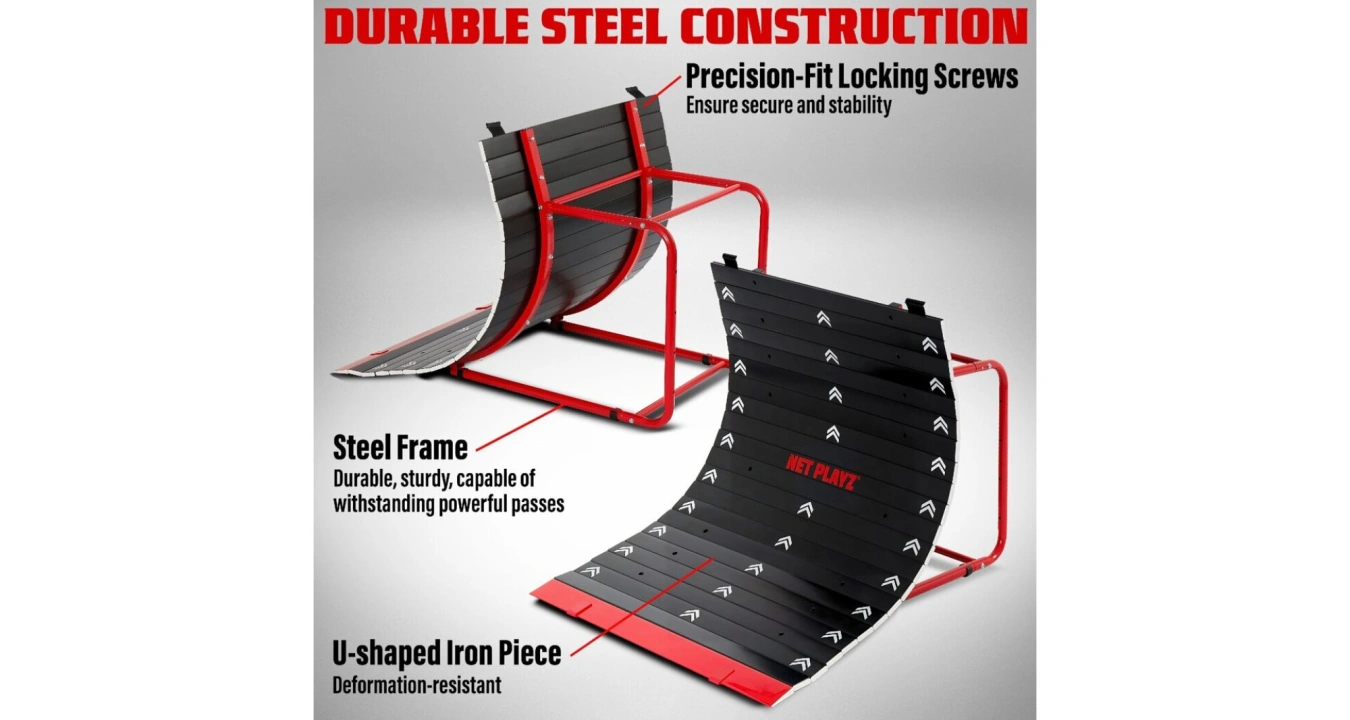 Skládací rampa s pevnou ocelovou konstrukcí pro trénink přihrávek a zpracování míče.