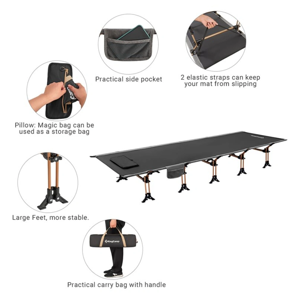 Camping skládací lehátko od předního kempinkového výrobce King Camp. Mimořádně pevný rám a rychlé složení díky výklopným nohám. Lehátko je díky malým přepravním rozměrům vhodné zejména pro rybáře a trampy.