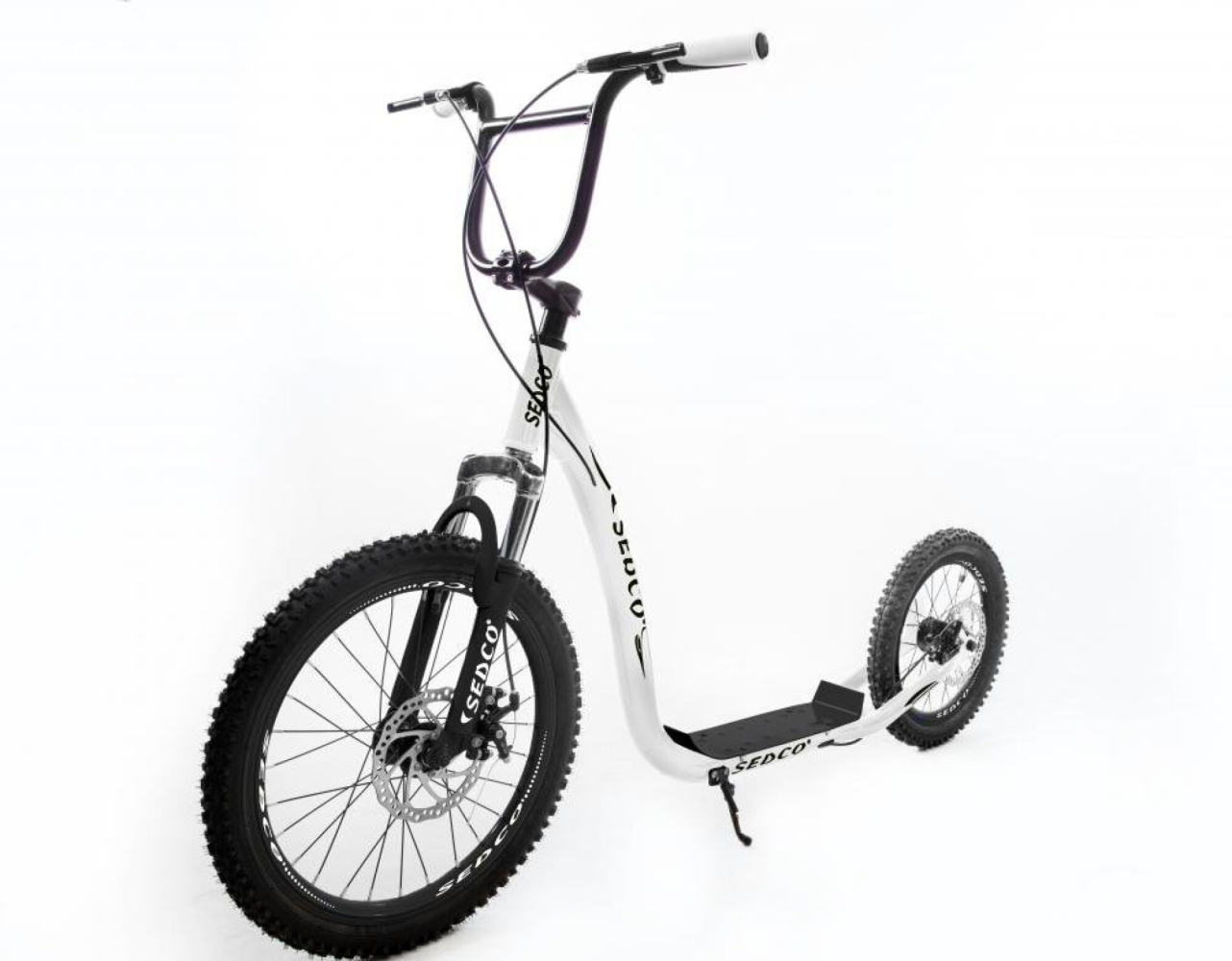 Nový model koloběžky 2018/19. Koloběžka Sedco Cross 3.2 se hodí pro aktivní koloběžkáře se sportovními ambicemi. S velmi odolným předním (20-ti palcovým) a zadním (16-ti palcovým) kolem snadno překonáte i terénní nerovnosti a díky zlepšenému stupátku využijete maximální délku odrazu a vaše nohy se tak snadno neunaví. S koloběžkou si však skvěle užijete i ve městě a stejně tak na zpevněných cestách. Koloběžka je vhodná pro mladší i starší jezdce s výškou od 140 do 180 cm. Základem konstrukce koloběžky je vystužený pevný hliníkový rám, zajišťující maximální bezpečnost a jistotu při jízdě. Koloběžka skvěle dominuje i na mírně obtížnějším terénu. To hlavně díky pneumatikám s vysokou odolností a schopností vstřebat i tlumit vibrace při jízdě na obtížnějším povrchu. Skvěle tomu napomáhá i odpružená vidlice, která spolu s nafukovacími koly, tvoří skvělou kombinaci při redukování vibrací. Koloběžká disponuje spolehlivými mechanickými kotoučovými brzdami tvořenými ze slitiny hliníku a oceli. Vynikající jízdní vlastnosti a stabilita i při vyšších rychlostech jsou dány krátkou vzdáleností kol (rozvorem) koloběžky. Nášlapná plocha však zůstala dostatečně dlouhá a umožňuje i stání sounož.