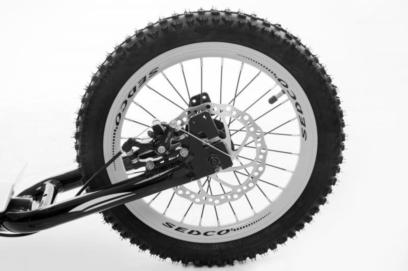 - Brzdy: přední i zadní mechanické kotoutové brzdy ze slitiny Alu
