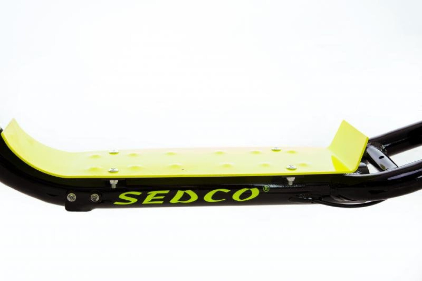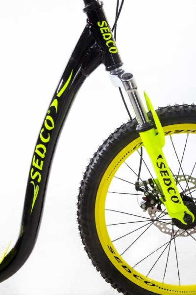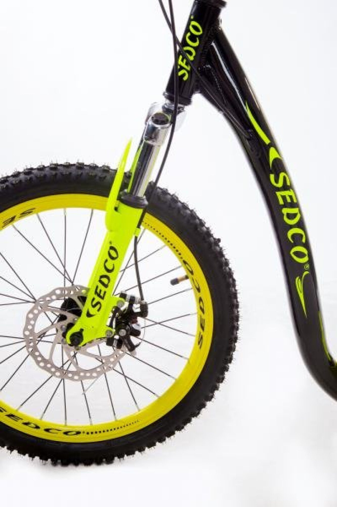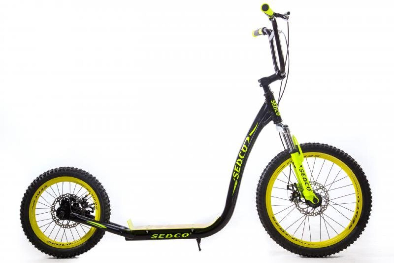 Nový model koloběžky 2018/19. Koloběžka Sedco Cross 3.2 se hodí pro aktivní koloběžkáře se sportovními ambicemi. S velmi odolným předním (20-ti palcovým) a zadním (16-ti palcovým) kolem snadno překonáte i terénní nerovnosti a díky zlepšenému stupátku využijete maximální délku odrazu a vaše nohy se tak snadno neunaví. S koloběžkou si však skvěle užijete i ve městě a stejně tak na zpevněných cestách. Koloběžka je vhodná pro mladší i starší jezdce s výškou od 140 do 180 cm. Základem konstrukce koloběžky je vyztužený pevný hliníkový rám, zajišťující maximální bezpečnost a jistotu při jízdě. Koloběžka skvěle dominuje i na mírně obtížnějším terénu. To hlavně díky pneumatikám s vysokou odolností a schopností vstřebat i tlumit vibrace při jízdě na obtížnějším povrchu. Skvěle tomu napomáhá i odpružená vidlice, která spolu s nafukovacími koly, tvoří skvělou kombinaci při redukování vibrací. Koloběžká disponuje spolehlivými mechanickými kotoučovými brzdami tvořenými ze slitiny hliníku a oceli. Vynikající jízdní vlastnosti a stabilita i při vyšších rychlostech jsou dány krátkou vzdáleností kol (rozvorem) koloběžky. Nášlapná plocha však zůstala dostatečně dlouhá a umožňuje i stání sounož.