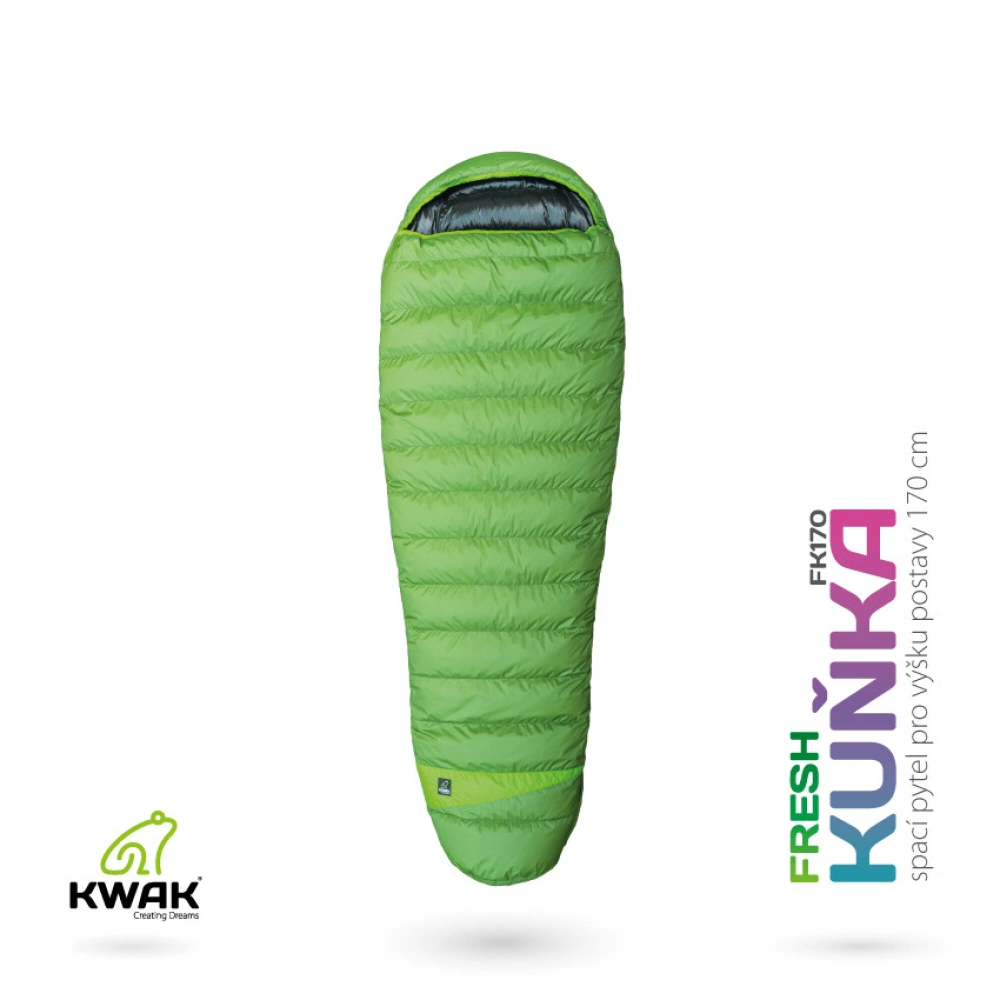 KWAK Spací pytel Fresh Kuňka FK170 je druhou generací našeho nejprodávanějšího modelu spacáku. Nový design je navržen pro jarní, letní a podzimní sezónu. Propracovaný střih „otevřené mumie“ je anatomicky tvarovaný se zipem ve tvaru „J“, který umožní úplné rozepnutí. Konstrukce komor ve tvaru „Z“ nejlépe zamezí úniku tepla neizolovanými místy tzv. studenými švy. Nechybí vnitřní krycí léga, vnitřní kapsa na osobní věci a 3D nastavitelný límec. Kapuce se stahuje pomocí gumičky s brzdičkou.
