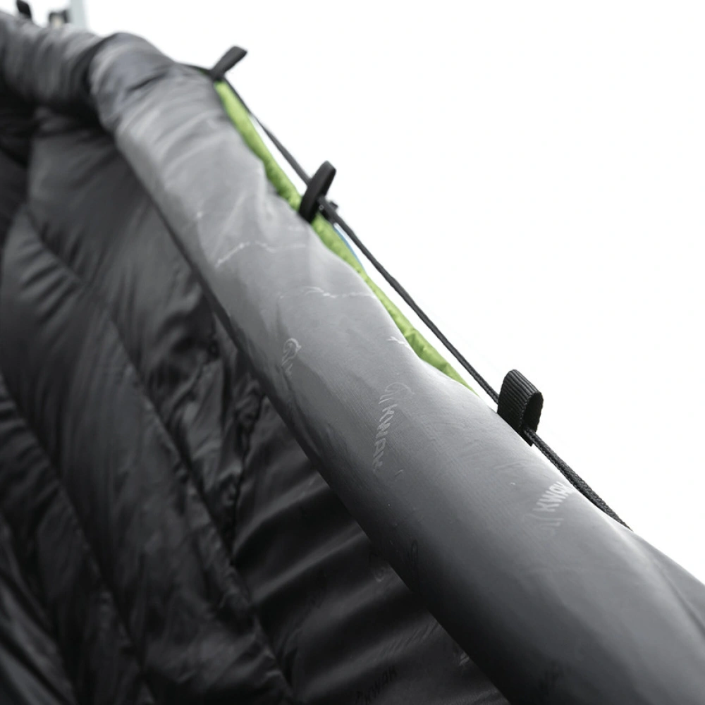 KWAK UnderQuilt Alkes L je ideálním doplňkem pro spánek v hamace. Jedná se o spodní zateplení, které je zavěšené pod hamakou a vytváří tak vzduchovou mezeru, čímž zaručuje maximální izolaci a tepelný komfort. UnderQuilt brání proudění chladného vzduchu a eliminuje tak tzv. ,,syndrom studeného zadku’’. Tato prodloužená varianta UnderQuiltu Alkes L poskytuje kompletní pokrytí těla, od hlavy až po paty, díky čemuž Vám nepromrznou ani okrajové části těla. Má voděodolnou povrchovou úpravu a je plněný nejkvalitnějším husím peřím. UnderQuilt Alkes L od značky KWAK s nanotechnologií vřele doporučujeme každému, kdo se chce komfortně vyspat v hamace i na podzim nebo v zimě.