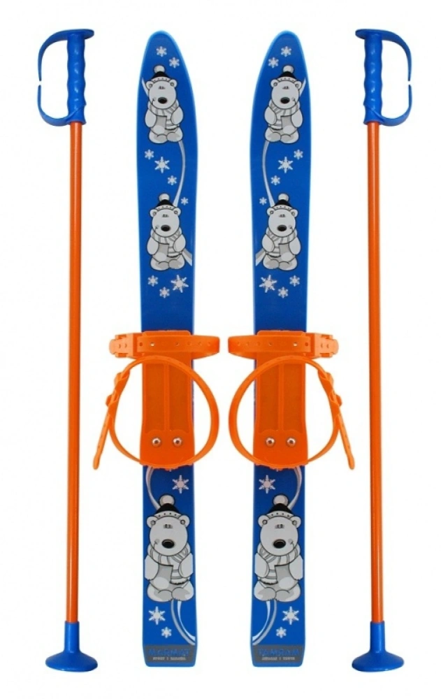 Sada obsahuje plastové lyže, pružné nastavitelné vázání a hůlky bez kovových hrotů.