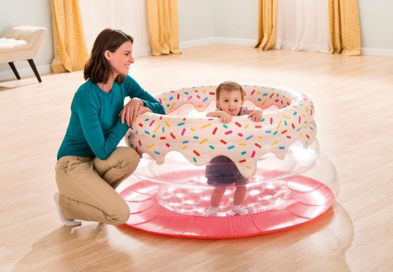 Dětská skákací ohrádka s trampolínou. Trampolíná má atraktivní realistický design koblihy, měkké nafukovací dno a bezpečné okraje. Výrobek je vhodný na domácí použití i na zahradu.