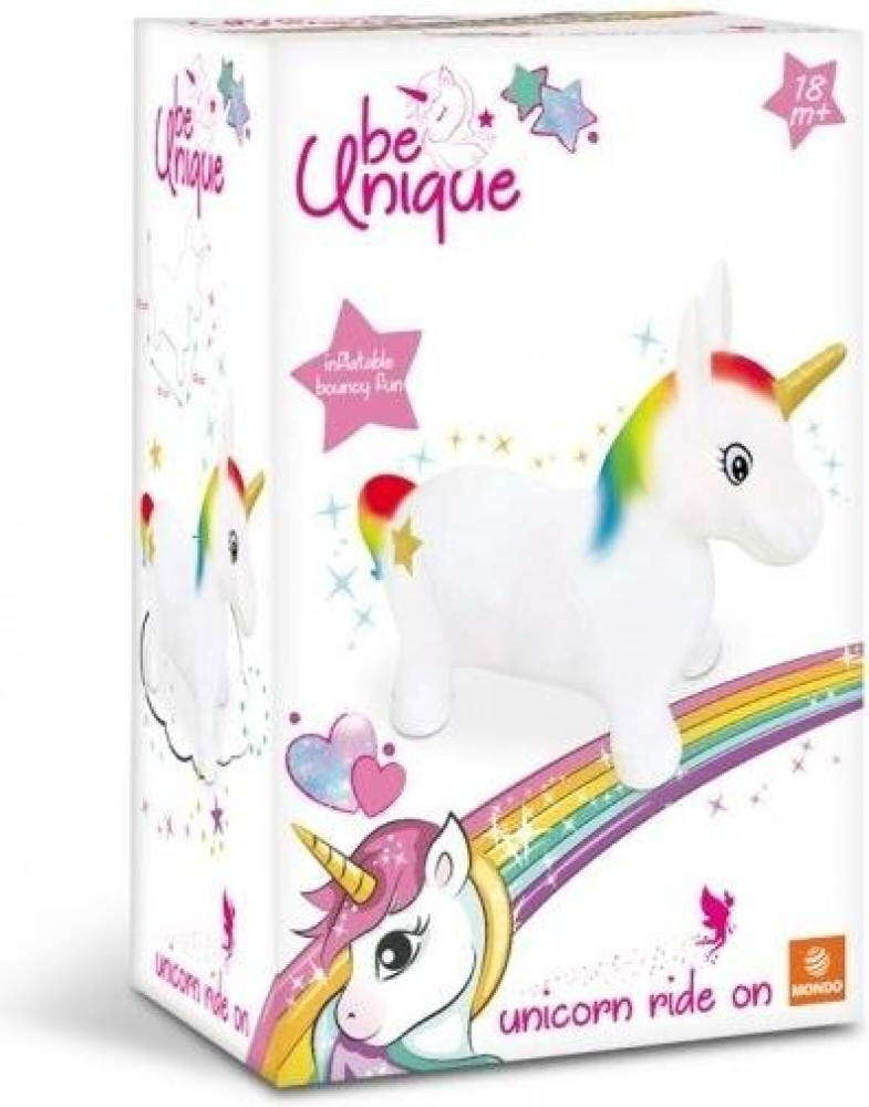 Veselé hopsadlo pro děti - bílý gumový jednorožec s duhovou hřívou a ocáskem - zabaví každého malého rošťáka.