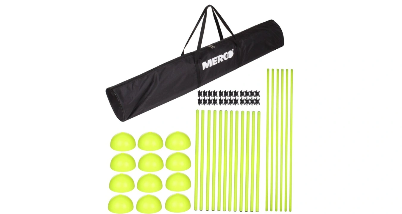 Set obsahuje celkem 6 víceúčelových výškově nastavitelných překážek Neon DS 11. Součástí je pevná polyesterová taška pro snadné přenášení a uskladnění.