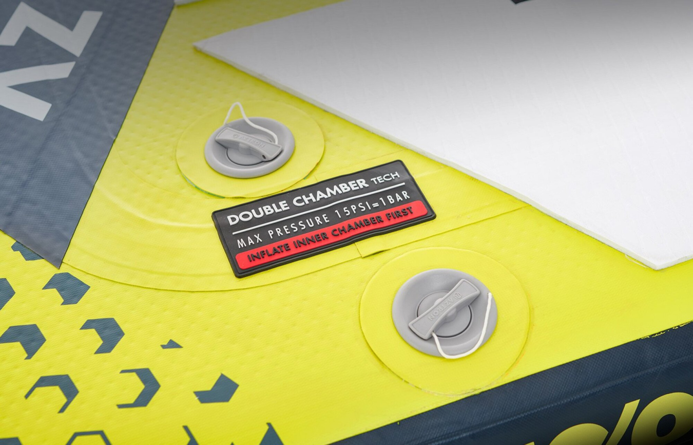 Dokonale bezpečná Aztron Double Chamber konstrukce je poznávací technologií značky Aztron a je použitá na všech Aztron nafukovacích paddleboardech. Dodatečná nafukovací komora dodává paddleboardu Aztron až 60 litrů bezpečnostní rezervy, která efektivně zajistí bezpečnost jezdce. Vnitřní nafukovací komora s extra vzduchovými pilíři je umístěná pod stojnou plochou a dodává paddleboardu až o 30 % více tuhosti. Díky technologii Double Chamber se budeš i na nafukovacím paddleboardu cítit jak při jízdě na pevné desce.