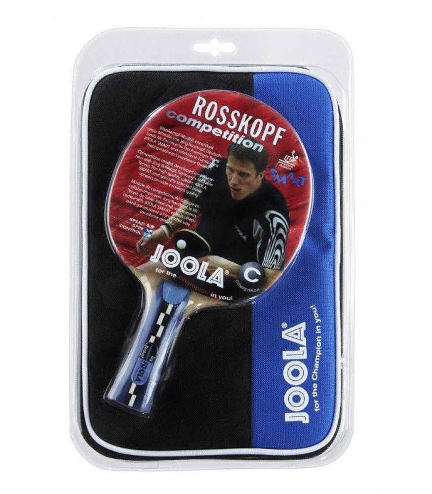 Rosskopf Competition je jedna z nejkvalitnějších stolních tenisových raket, které nabízí německá společnost Joola. Tato raketa používá kombinaci naprosto spolehlivého potahu s lepkavou horní vrstvou a speciální úpravou houby pro jedinečnou kontrolu nad hrou. Rosskopf Competition je ideální pro profesionální hráče, kteří už umí zahrát všechny základní tahy a úspěšně uplatňovat strategii k jejich hře. Pálka je dodávána s ochranným obalem proti prachu i případnému poškození při transportu.