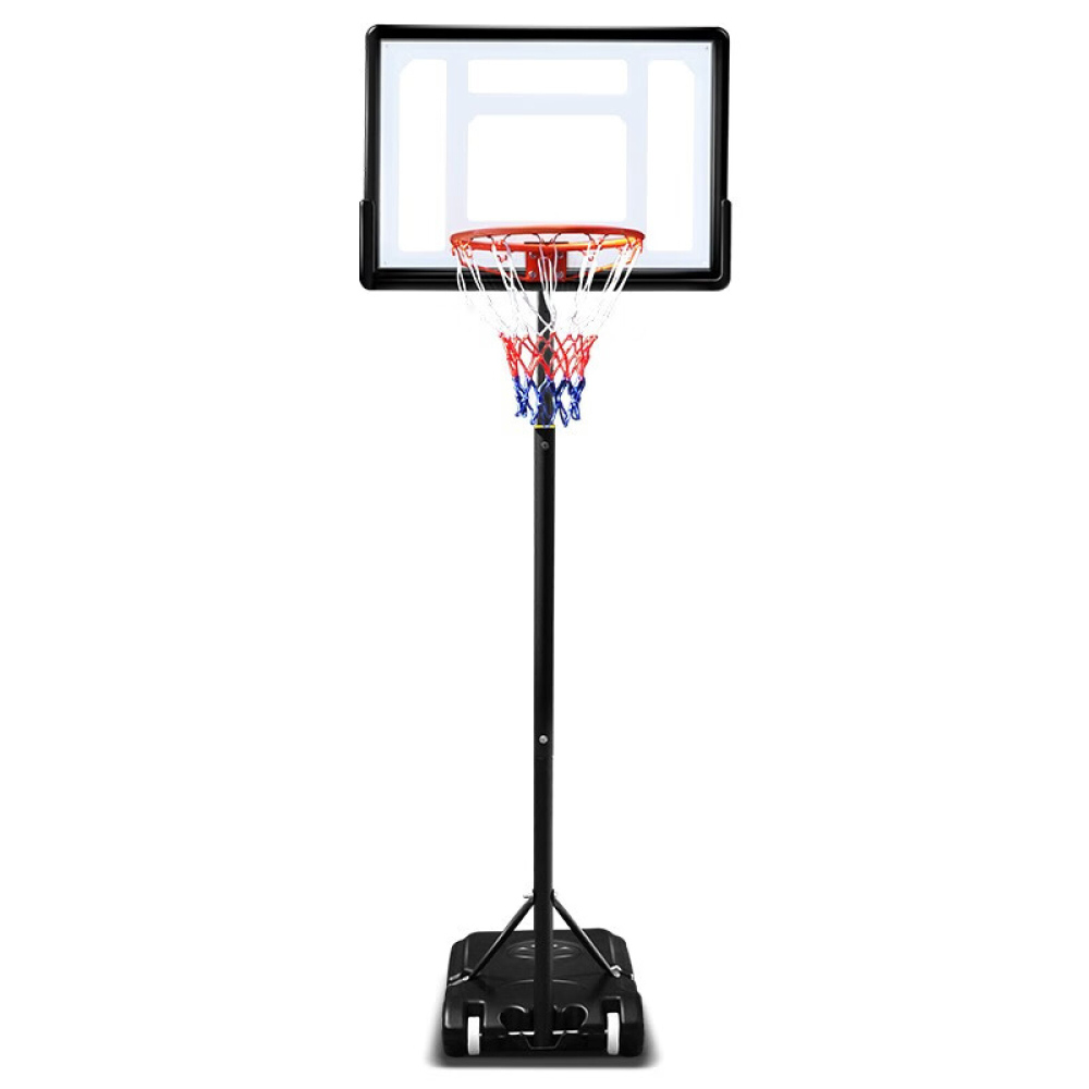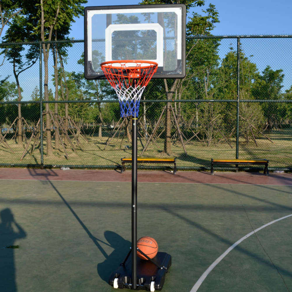 Průhledná deska z odolného PVC s černo-bílým rámem působí čistě a moderně. Obruč má klasické rozměry pro dětské koše a doplňuje ji tříbarevná síťka v odstínech červené, modré a bílé. Pevná černá základna se plní vodou nebo pískem, díky čemuž drží celou konstrukci stabilně i při energičtější hře.