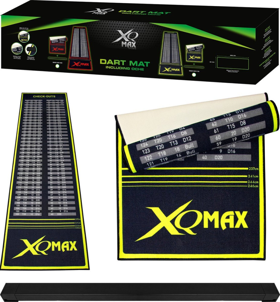 Koberec XQ Max je perfektní doplňek k terči. Vhodný pro domácí/rekreační i klubové využití. Perfektně sedne jak do obývacího pokoje, garáže nebo klubovny. Nově navržený koberec dodá hře profesionální atmosféru, která inspiruje. Koberec s horním motivem Check Out Mat. Tento šipkařský koberec je velmi odolný a díky vysoké kvalitě poskytuje optimální ochranu pro padající šipky. V balení najdete také odhodovou čáru.