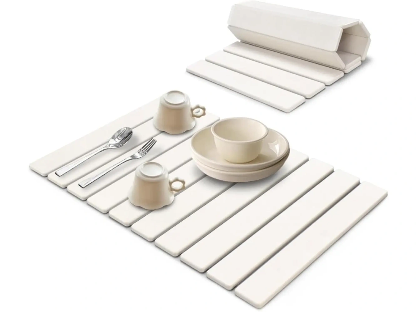 Bělavý off-white tón podložky působí svěže a čistě, ale zároveň nenaruší celkový dojem žádné kuchyně, koupelny ani předsíně. Povrch je příjemný na dotek, pevný a odolný, navíc protiskluzový, takže se nemusíte bát uklouznutí mokrého hrnku nebo nože. Když podložku nepoužíváte, složíte ji jako list papíru a uložíte třeba vedle trouby nebo do šuplíku v kuchyňské lince.