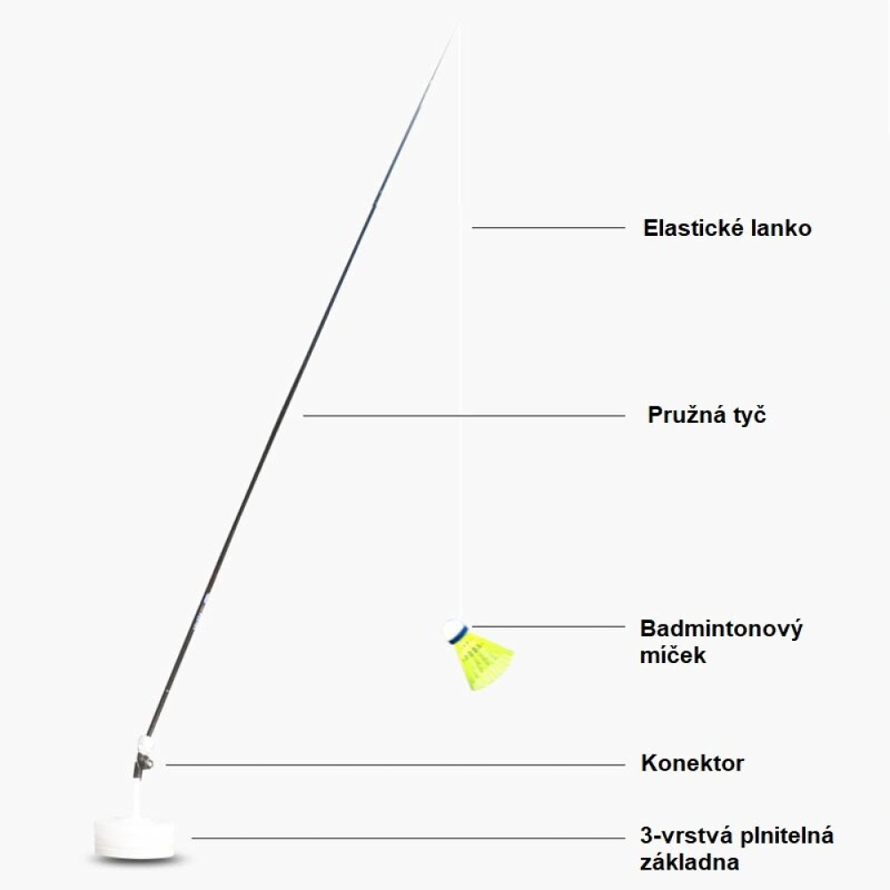 Badmintonový trenažér Merco Badminton Rebounder je ideální tréninková pomůcka pro všechny badmintonové hráče, kteří zrovna nemají k dispozici spoluhráče a chtějí trénovat údery a techniku. Badmintonový trenažér je vhodný pro hráče všech výkonnostních úrovní – pro úplné začátečníky i pravidelné hráče / hráčky. Díky jeho rozměrům je určený především pro venkovní použití nebo v tělocvičně s vysokým stropem. Trenažér je lehce skládací a složíte jej během pár minut, můžete si jej tedy kdykoliv vzít i s sebou do parku či na dovolenou. Celý set se skládá ze třech základen (ABS plast) plnitelných vodou, nastavitelného spojovacího konektoru, skládací flexibilní tyče (sklolaminát) o celkové délce 335 cm, balení gumiček k zavázání badmintonového míčku, sady tréninkových míčků a jedné hliníkové rakety na badminton.