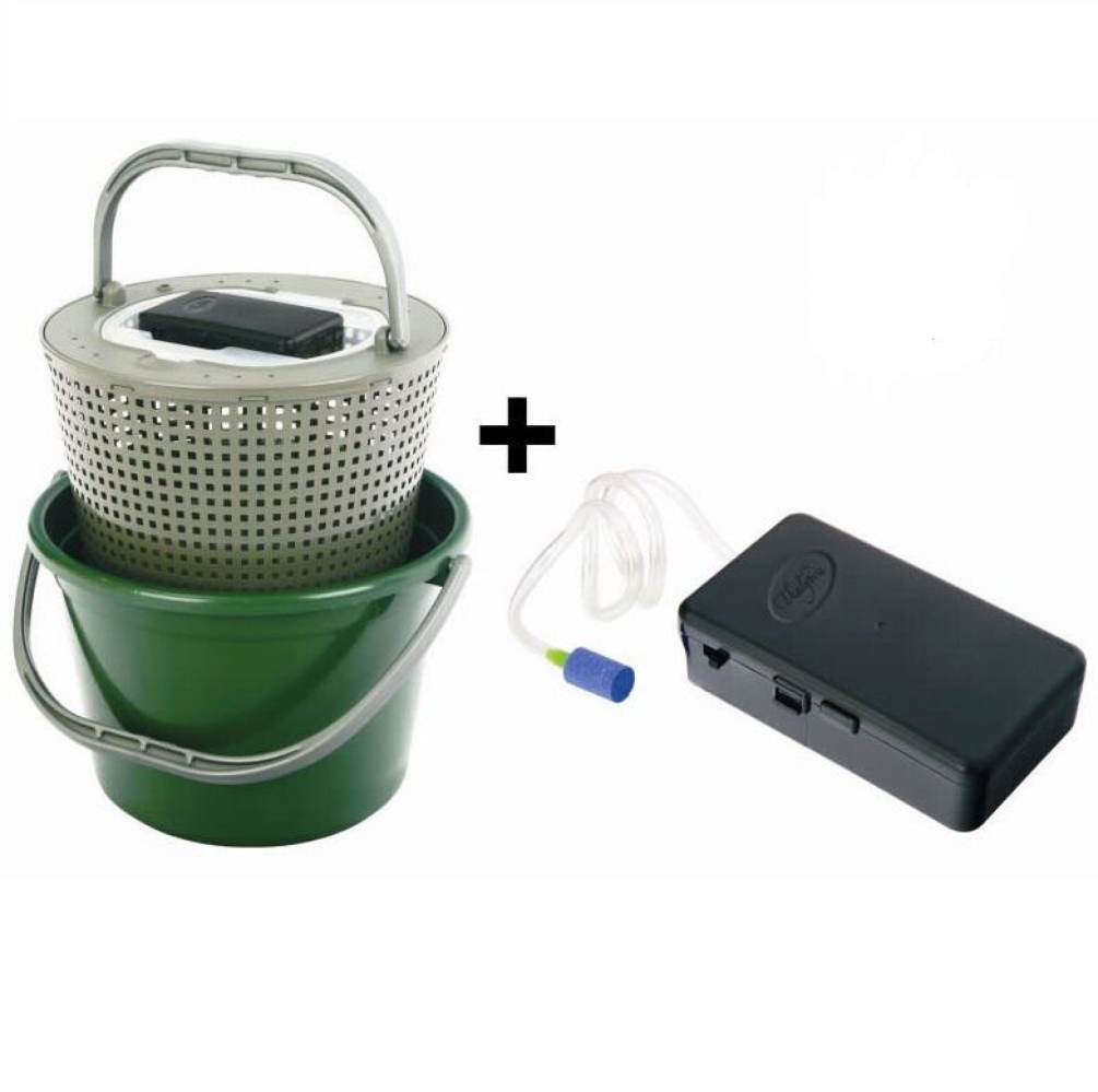 Bateriový vzduchovací motůrek, který je napájen dvěma bateriemi.