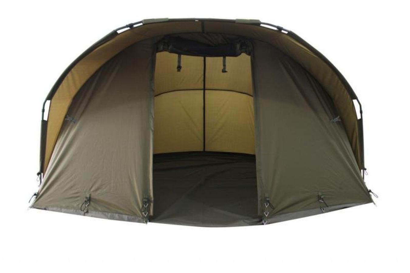 Skvělý velkoprostorový bivak z velmi odolného 210D Materiálu s vodním sloupcem až 5000MM. Celková konstrukce je tvořena z posílených trubek, jednoduše spojitelných a plně bezpečných. Výsledná kontrukce bivaku má běžný tvar s předním "kšiltem", samozřejmě se spoustou vylepšení. Voděodolný materiál je zde samozřejmostí, stejně jako odjímatelná podlážka na suchý zip. Prodloužená stříška chrání celou plochu dveří. Podlahu je možno uchytit suchými zipy po částech obvodu bivaku.