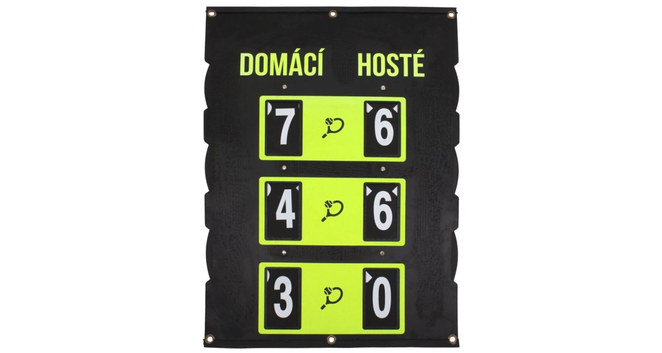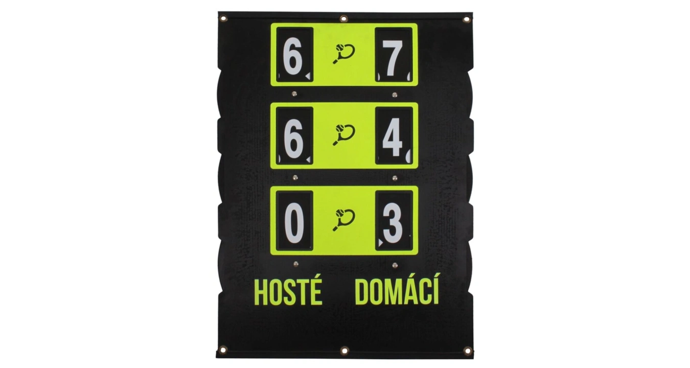 Oboustranný ukazatel skóre pro tenisové hráče a kluby. V českém jazyce, rozměr 83 x 58 cm.