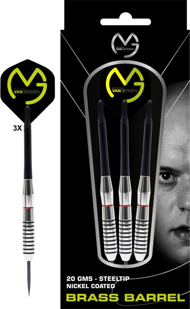 Steelové mosazné šipky Michael van Gerwen 20g jsou skvělou volbou pro všechny hráče. Elegantní a stylové barrely jsou doplněny o nylonové násadky a letky s logem MVG.