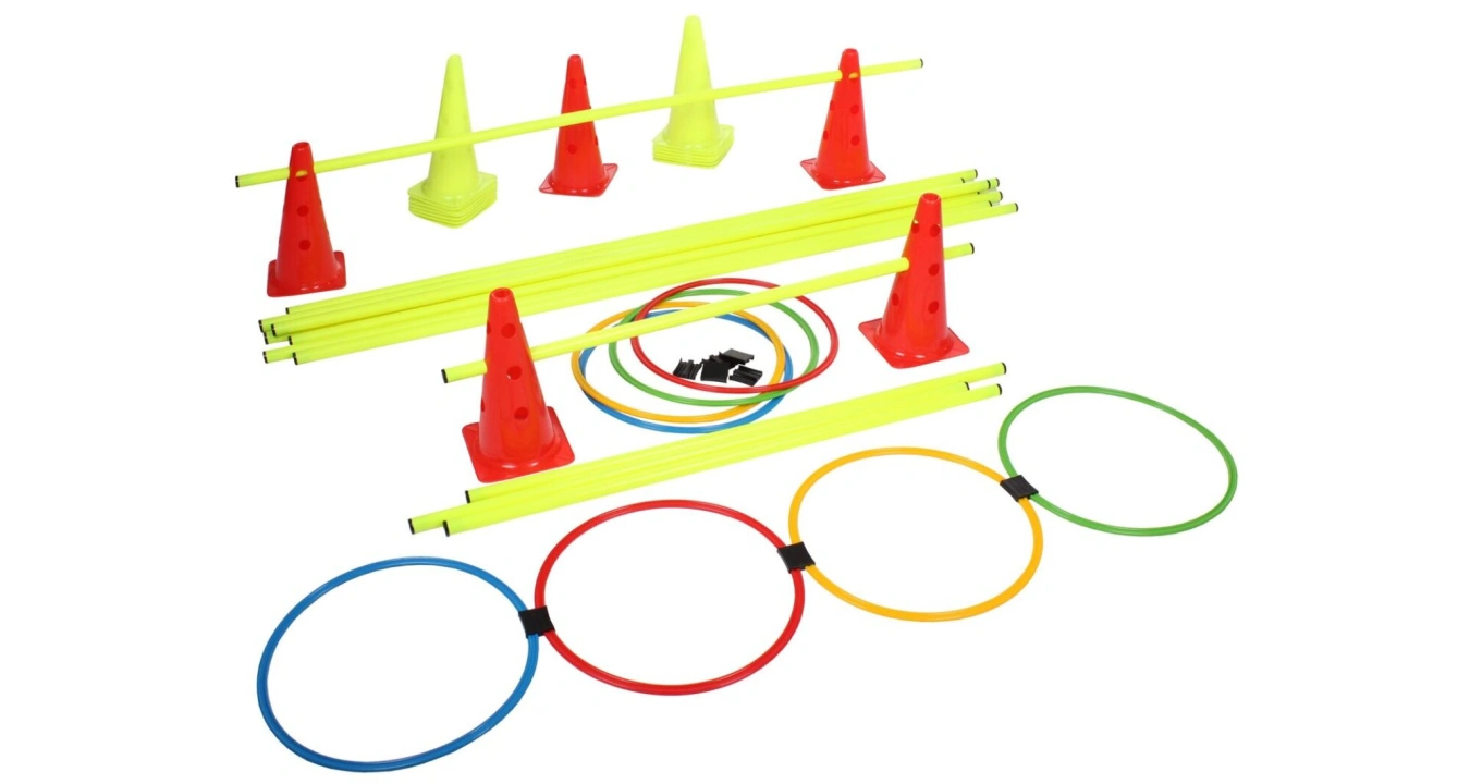 Tréninková agility sada pro vytvoření překážkové dráhy. 18 kuželů, 13 tyčí a 8 kruhů. Včetně praktického vaku.