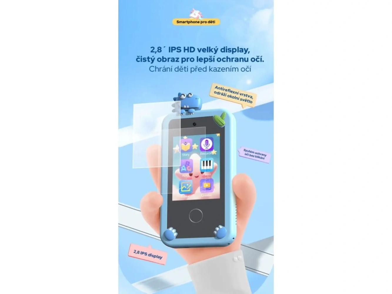 Přilepené oči na modrou obrazovku? V žádném případě, tento dětský smartphone je vybavený obrazovkou s 2,8" IPS obrazovkou s antireflexní vrstvou, oči dítěte tedy nejsou namáhané jako u klasické obrazovky tabletu nebo mobilního zařízení. Obrazovka je dotyková a přístroj je přizpůsobený pro malé ručky a prstíky. Dále jistě potěší možnost vybrat z více než dvou desítek tapet nebo možnost vytvářet vlastní fotografie a videa v rozlišení 1920x1080 pixelů.