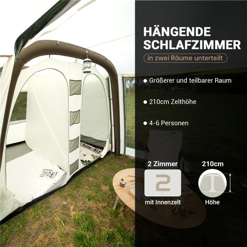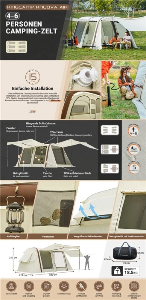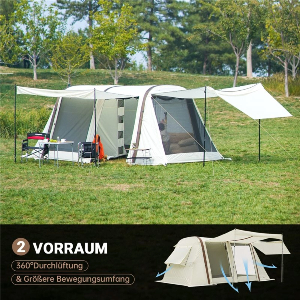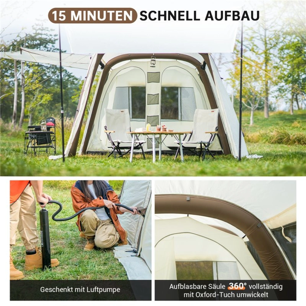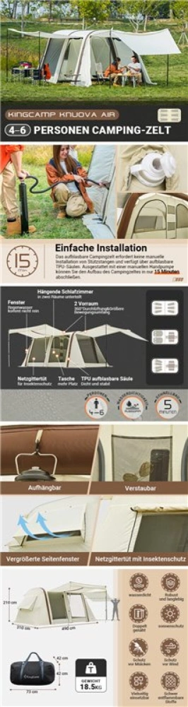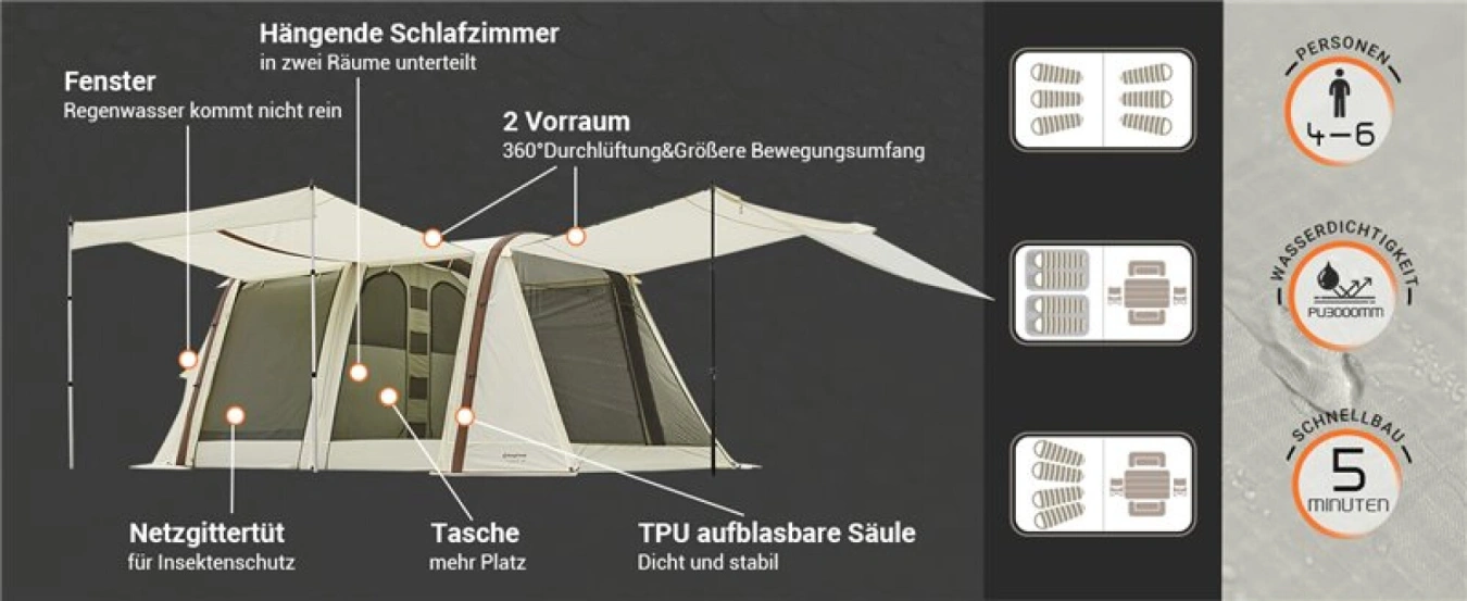 Velký rodinný stan vynikající kvality pro 6 - 8 osob s nafukovací konstrukcí, který je velmi dobrý na vaši dovolenou a udrží vodní sloupec min. 3000 mm.