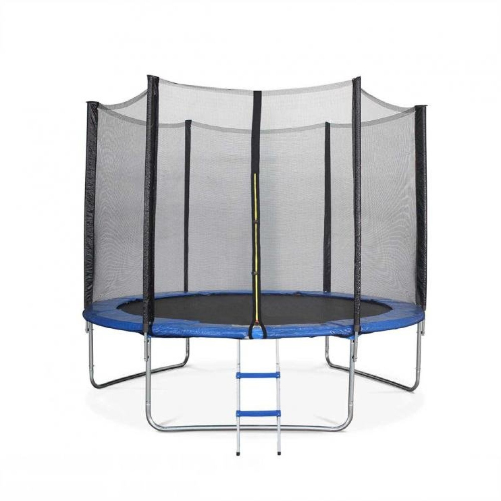 Ochranná síť je vyrobena z materiálu PE UV resistent a je uchycena tak, aby neomezovala volný prostor ke skákání, veškeré spoje sítě jsou opatřeny vyměkčovací ochranou. Foto trampolíny je ilustrační.